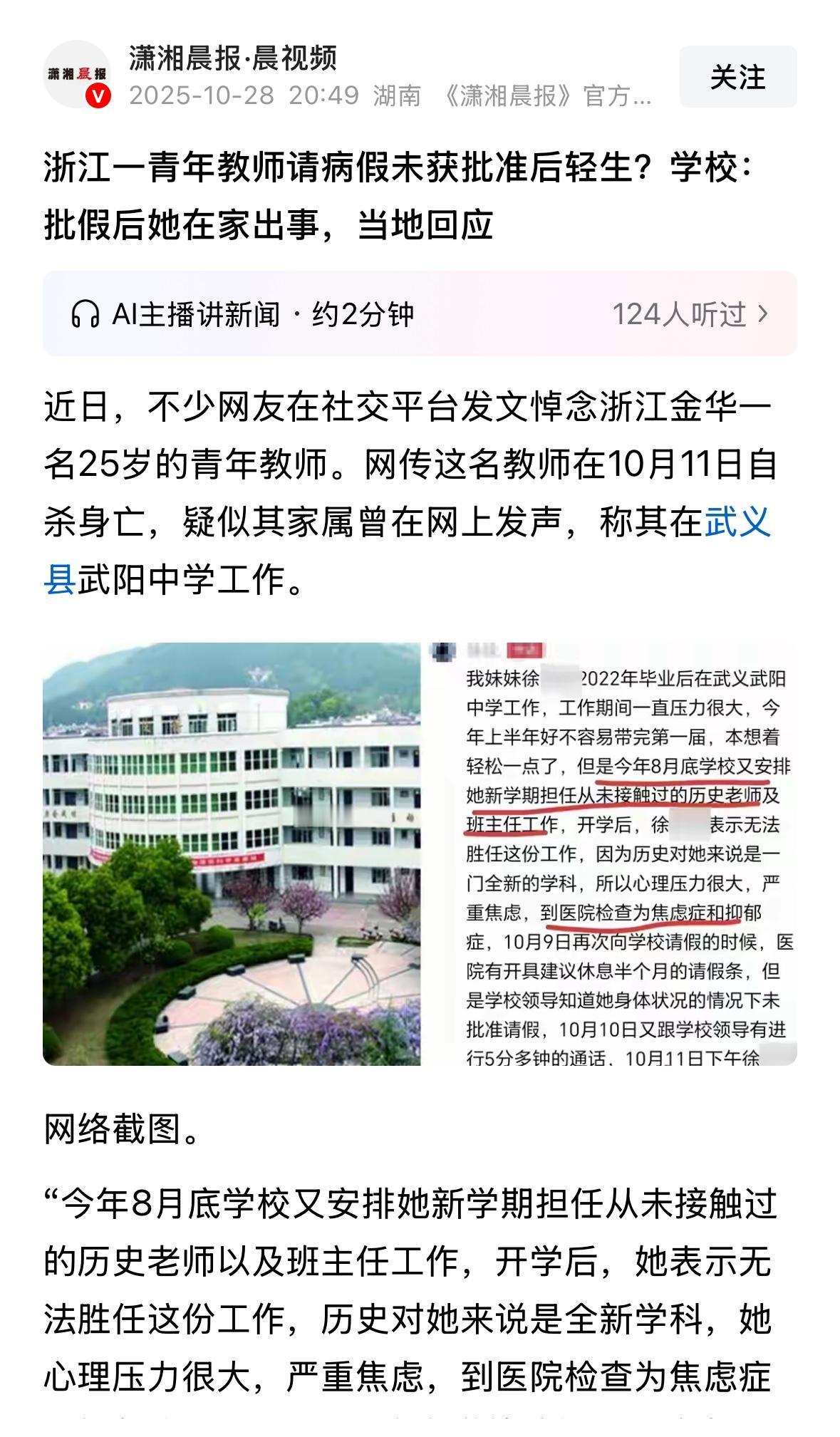 浙江徐老师的死提醒广大老师,别把工作太当回事。只是一份工作而已。能当老师就当,不当就辞职。尤其是年轻教师转行干什么不行,就非得要当老师吗?很多时候压力都是自己给的,学校都不担心你教不了历史,自己还担心什么呢?如果到时真发现自己教不了历史,学生都会有意见,家长也会有意见,就让家长去跟学校反映吧,何必自寻烦恼呢?