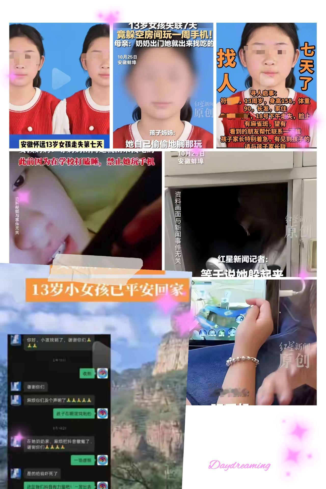 安徽13岁女孩失联7天,找到时的地点真让人惊掉下巴!居然就躲在奶奶家二楼的空屋里,离自己家走路才十分钟,全家急得快疯了,祖孙俩愣是没照面! 女孩就是因为妈妈收了她的手机,怕影响学习,她就偷偷拿了手机躲去奶奶家,白天等奶奶出门才敢去厨房找吃的。这事儿看着是虚惊一场,可细想真后怕——家长管手机没错,但硬来反而让孩子用“躲起来”对抗。 其实管孩子玩手机,哪是“收手机”这么简单?要是能跟孩子商量着定规矩,比如每天玩多久,是不是就不会闹成这样?你们家孩子要是爱玩手机,都是怎么跟孩子沟通的呀?