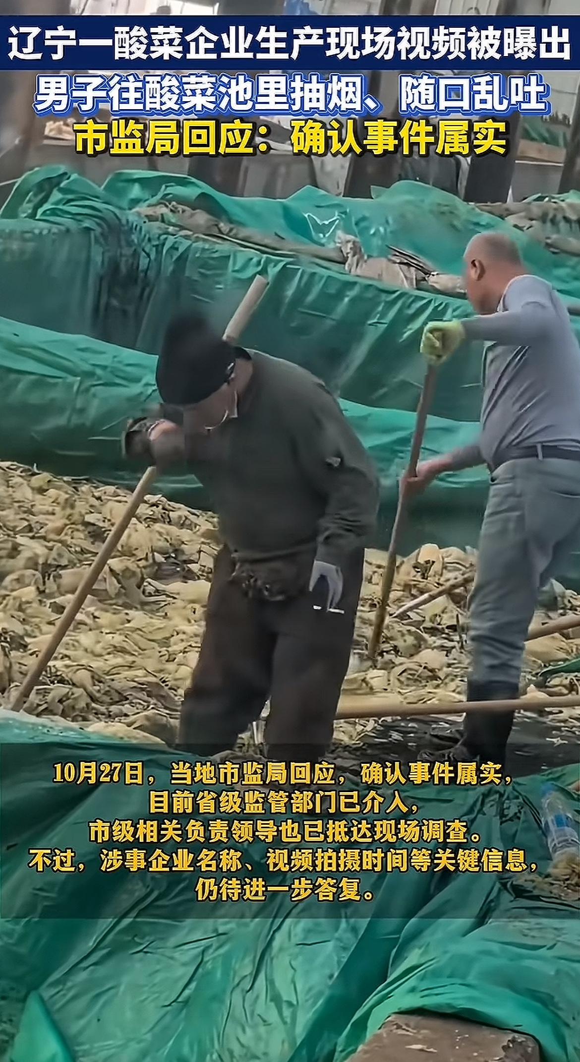 全体东北酸菜企业要哭晕。 该酸菜企业能不能长点心,员工穿着不正规也就算了,你选员工能选不吸烟的吗? ​众所周知,吸烟的人自然伴随喉咙不舒服,卡老痰是常见,必须经常吐痰。食品车间本来就该严抓卫生,选员工的时候避开吸烟者不是基本操作吗?结果这家倒好,不光招了吸烟的员工,还是工作时间当面抽,随意吐的,看那熟练的样子,明显早就习以为常了,这样卫生条件做出来的酸菜敢吃? 315老坛酸菜的阴影还没完全散呢,现在又来这么一出!虽然没说具体是哪家,但网友已经开始避雷整个葫芦岛的酸菜,连带着东北酸菜都被连累,正经做酸菜的企业也太冤了吧! 本来还爱买点酸菜炖粉条,看完这新闻我是真的怕了,感觉外面的腌制产品都不敢随便买了。有没有友友跟我一样,现在对预制菜、腌制菜都有阴影了?