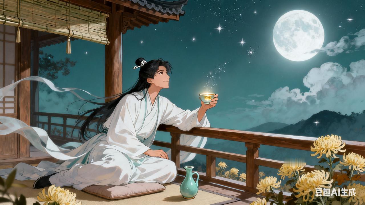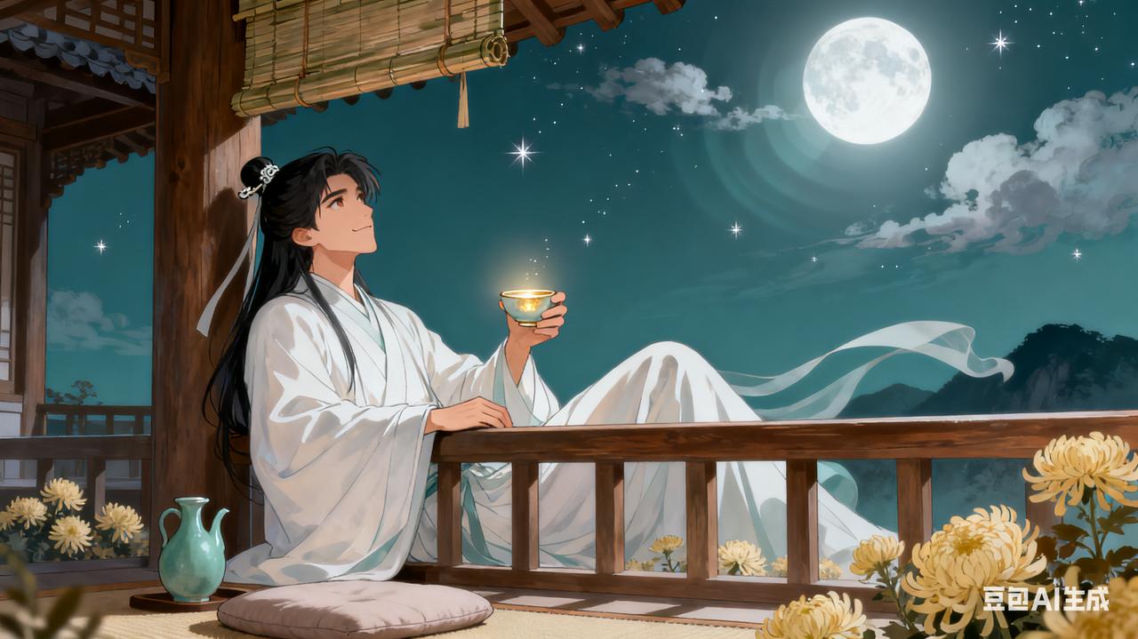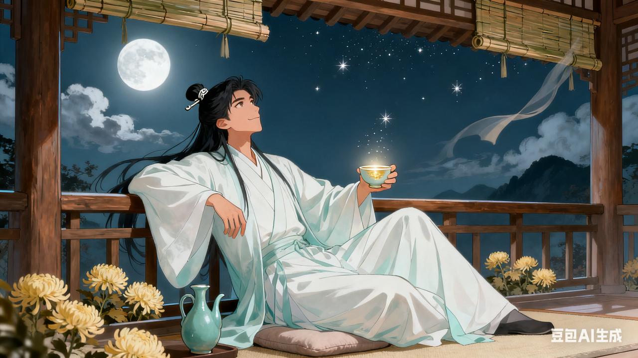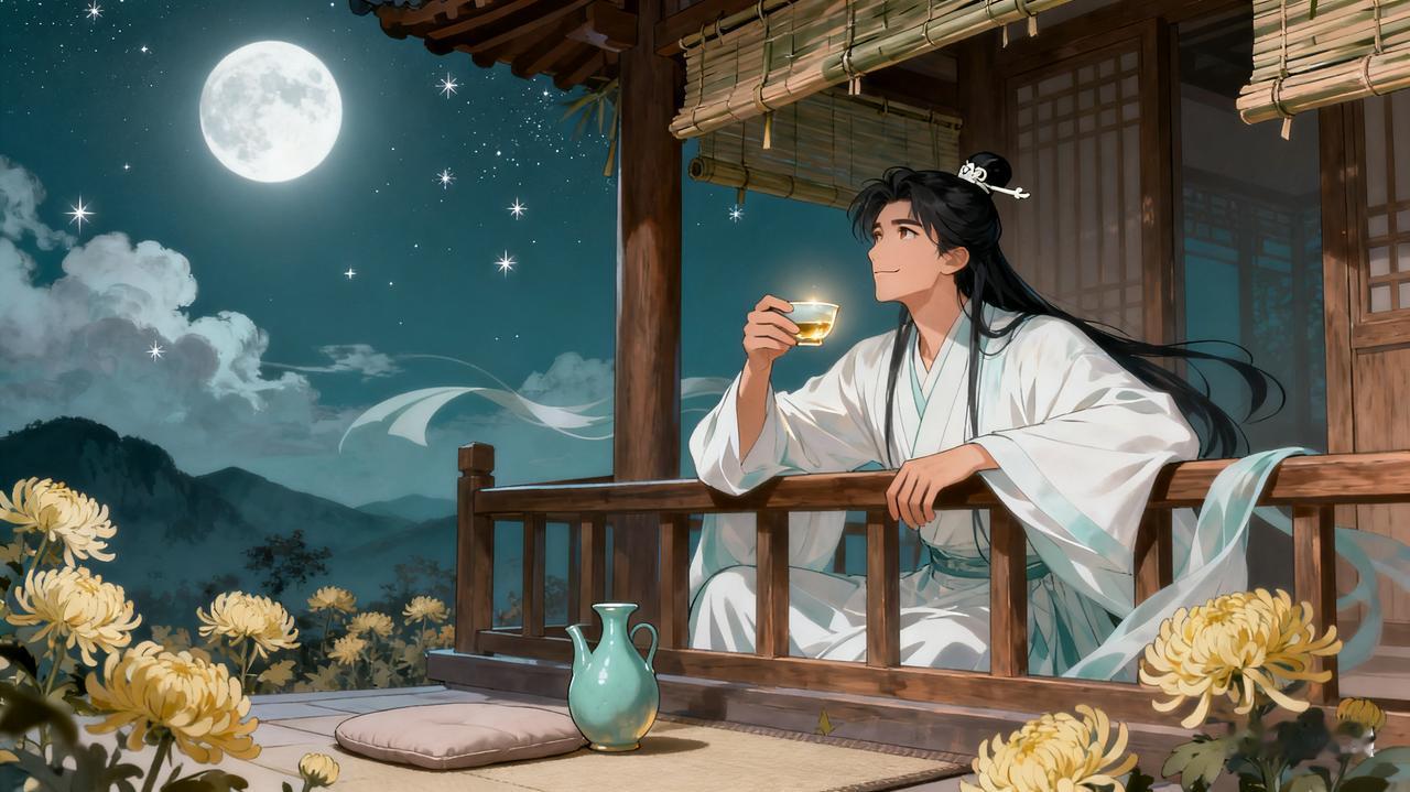 清风明月醉西楼,笑卧红尘又一秋。 醉饮杯中二两酒,抬眸又见星垂岫。 俗事皆随云影走,何须惆怅少年游。 1. 角色设计:主角身着月白宽袖长衫,墨发用玉簪松松束起,半倚在西楼木质栏杆上,左手握着浅釉酒盏(盏中剩半杯酒,泛着微光),唇角带浅醺笑意,眼神慵懒望向夜空,尽显“笑卧红尘”的闲适。 2. 场景细节:西楼为黛瓦木构,檐角挂着半卷竹帘,帘边垂着细穗;栏下种着几丛浅黄秋菊(呼应“又一秋”),地面铺素色蒲团,旁置青瓷酒壶;夜空悬着一轮圆月,云絮轻飘,几颗疏星垂落远山轮廓(对应“星垂岫”),风动衣袂的线条柔缓,凸显“俗事皆随云影走”的松弛感。 3. 色彩基调:以月白、浅青、暖棕为主色,月色用清透白光晕染,星子点细碎银辉,酒盏泛淡金光泽,整体色调柔和雅致,贴合诗句的清幽豁达意境。对月吟诗酌清风 半帘月影寄新愁 秋日登楼感怀 醉月客诗联 醉月客诗联 清月照南楼 西楼赏月 何不邀月敬红尘
