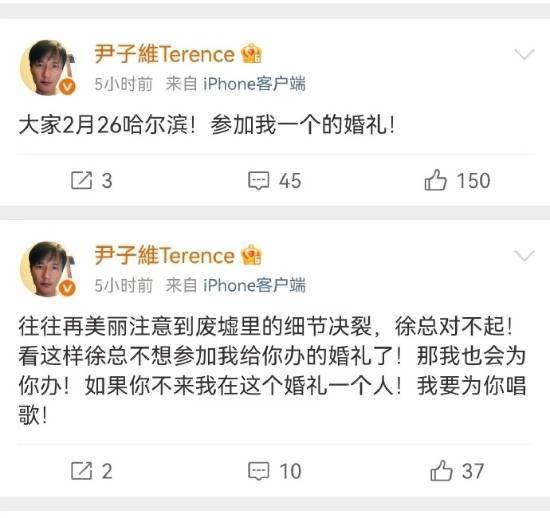 尹子维深夜发文坚持独自举办婚礼,徐冬冬与他之间的矛盾再次升级,引发网友热议。