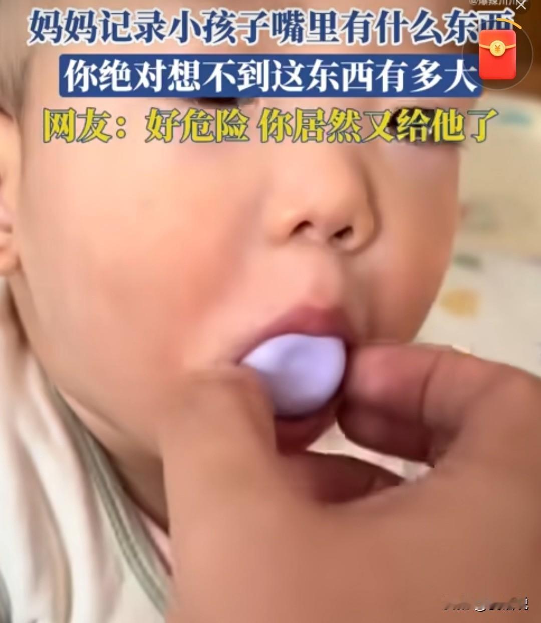 宝宝将一个紫色圆球体塞入嘴巴,家长用手抠,可是球体体积比嘴大,好几次都又缩了进去,看得好惊险,就怕孩子把它吞进去! 家长越抠,孩子越紧张,那小嘴闭得越,嗖一下,球又缩回去了。 我的心,吓得怦怦跳 孩子可能还觉得好玩,完全不知道危险 最后终于把紫色球抠出来了。 家里有小宝的,一定要把这种小物件,小玩具收好 带娃真是半秒钟都不能大意 安全第一啊 @婴语说 给家长一些建议 1,宝宝异物卡嘴里,切勿直接上手抠。强行去抠可能将其推得更深,导致窒息风,正确的做法是鼓励孩子尝试主动吐出,或让宝宝身体前倾,轻拍背部协助排出。 2,家长要有意识地做好家居安全防护,将硬币、纽扣电池,小玩具等容易被孩子误吞的小物件,放在宝宝无法触及或打开的容器里 3.,灌输安全观念。利用各种机会,用简单的语言向宝宝灌输东西不能往嘴里放,逐步帮助他建立安全意识。
