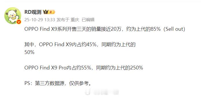 1、OPPO Find X9系列首售三天的量,是上一代OPPO Find X8系列的85%。同比下滑了;