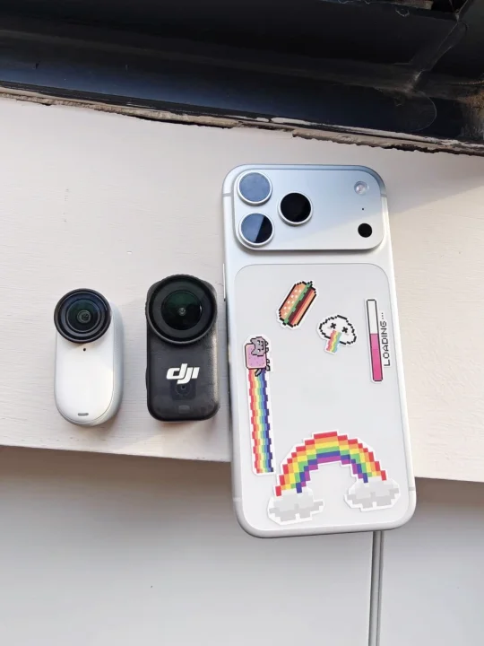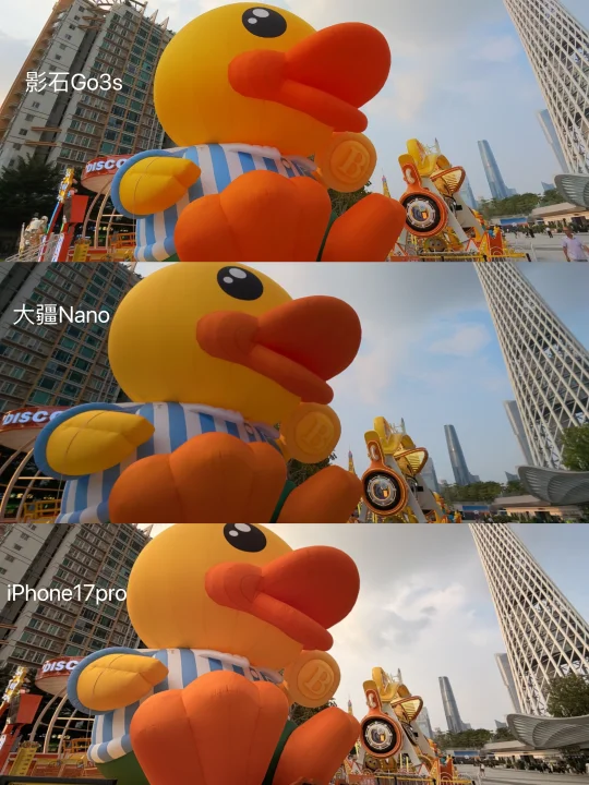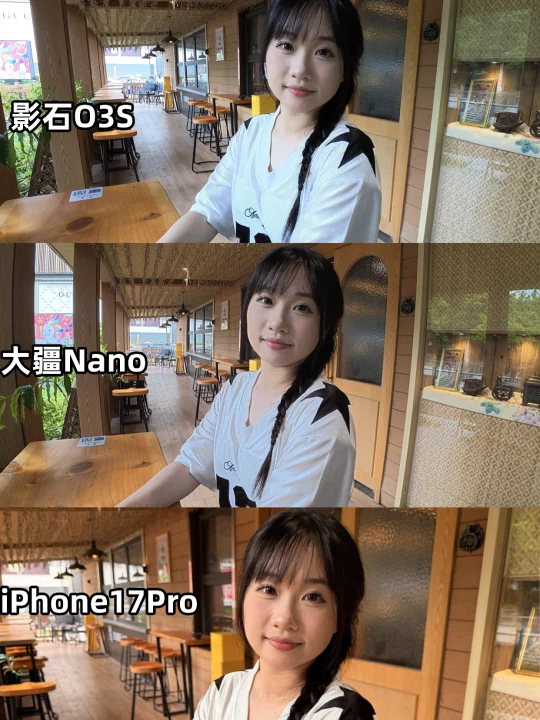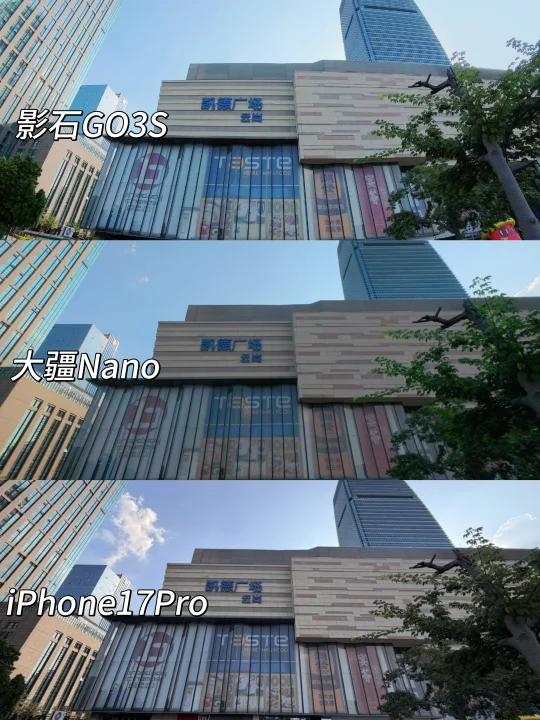 前几天大疆Nano拇指相机发布了,看网上的测评说画质挺不错的,能磁吸各种地方,拍摄方式很丰富,于是我好奇,拿来和影石GO3S比了下,影石还是比较小巧的,日常拍照和视频会比较好携带。 人像上,影石看起来人物比较白皙好看,大疆稍微暖一些,iPhone17Pro的人物就更黄了,拍照日常风景上,三者的视频画质不相上下,影石的影调个人是比较喜欢的,你们喜欢哪一个呢? -