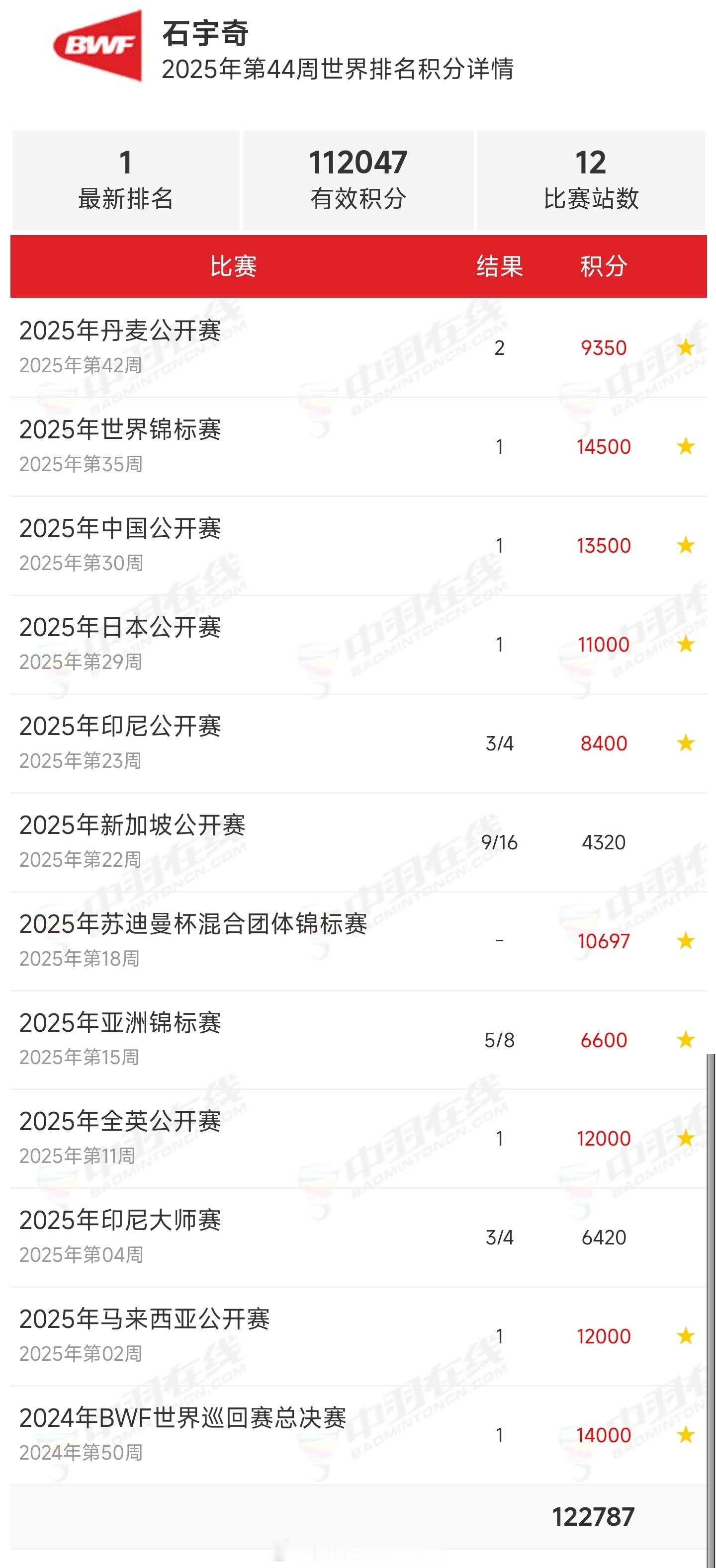 ⭐同时 也凭借着自己历史最高积分112047提前锁定了男单年终世界第一,女双圣坛组合也提前锁定了年终世界第一! 恭喜!