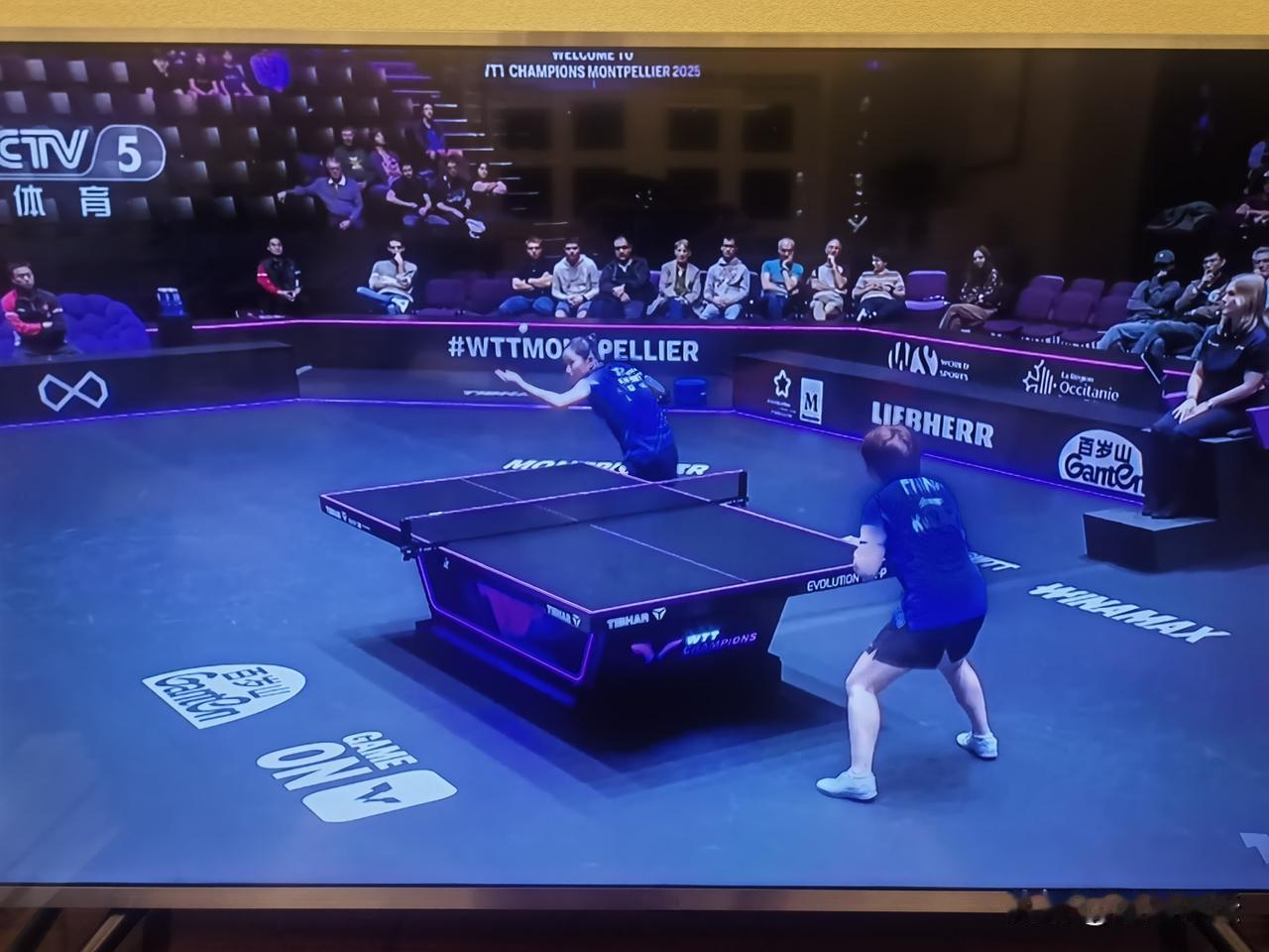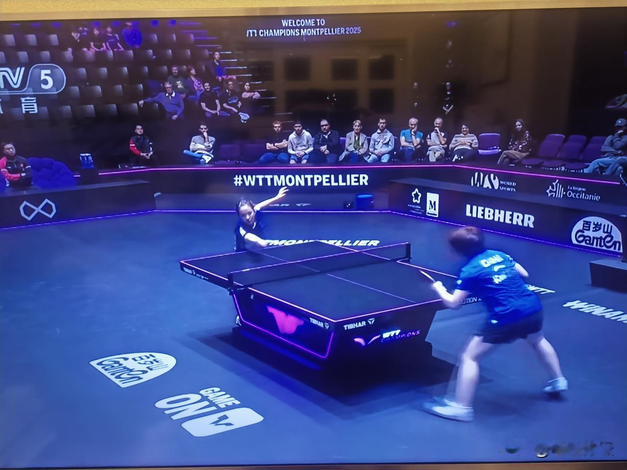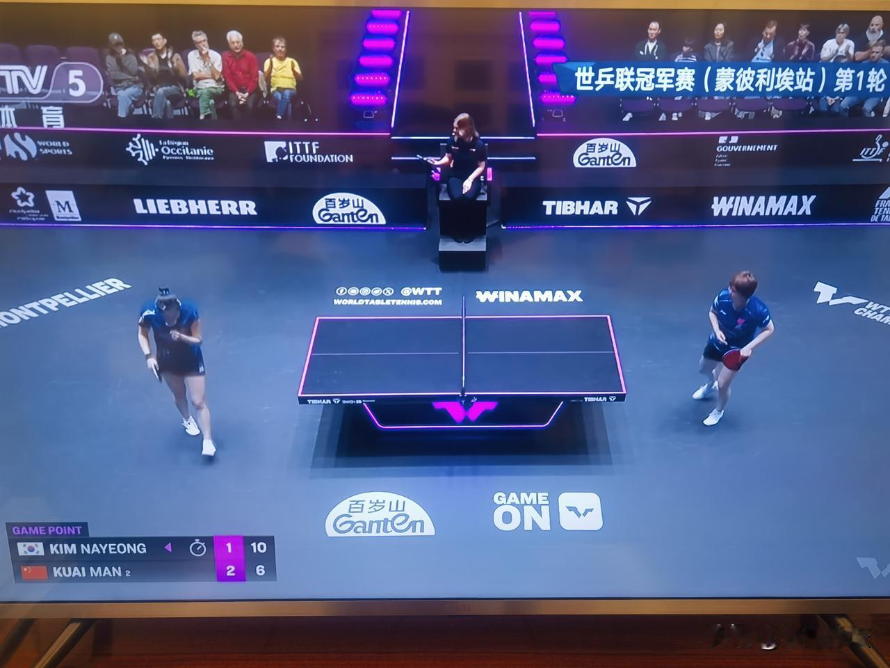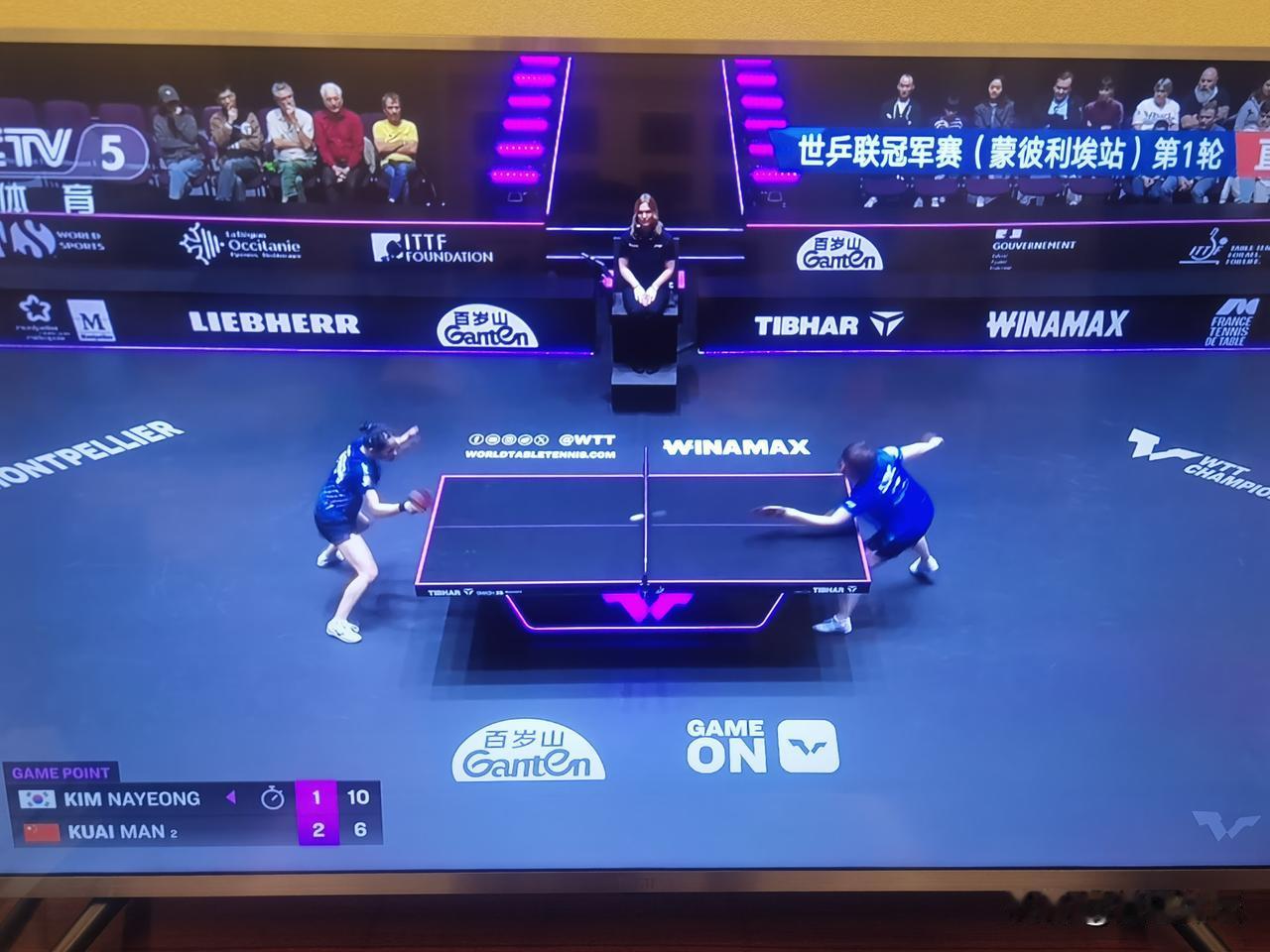 金娜英再赢一局,比分来到2:2,把比赛拖入到决胜局!第四局蒯曼感觉不会打球了,球不过网!蒯曼在先丢第一局以后,连板两局,把大比分扳成了二比一,没想到第四局蒯曼失误不断,被韩国的金娜英扳平了二比二!把比赛拖入到了决胜局第五局,在第五局韩国的金娜英气势如虹,在气势上完全占据了上风,目前的决胜分来到了3:4!蒯曼又落后了!这场比赛让人看的是惊心动魄!