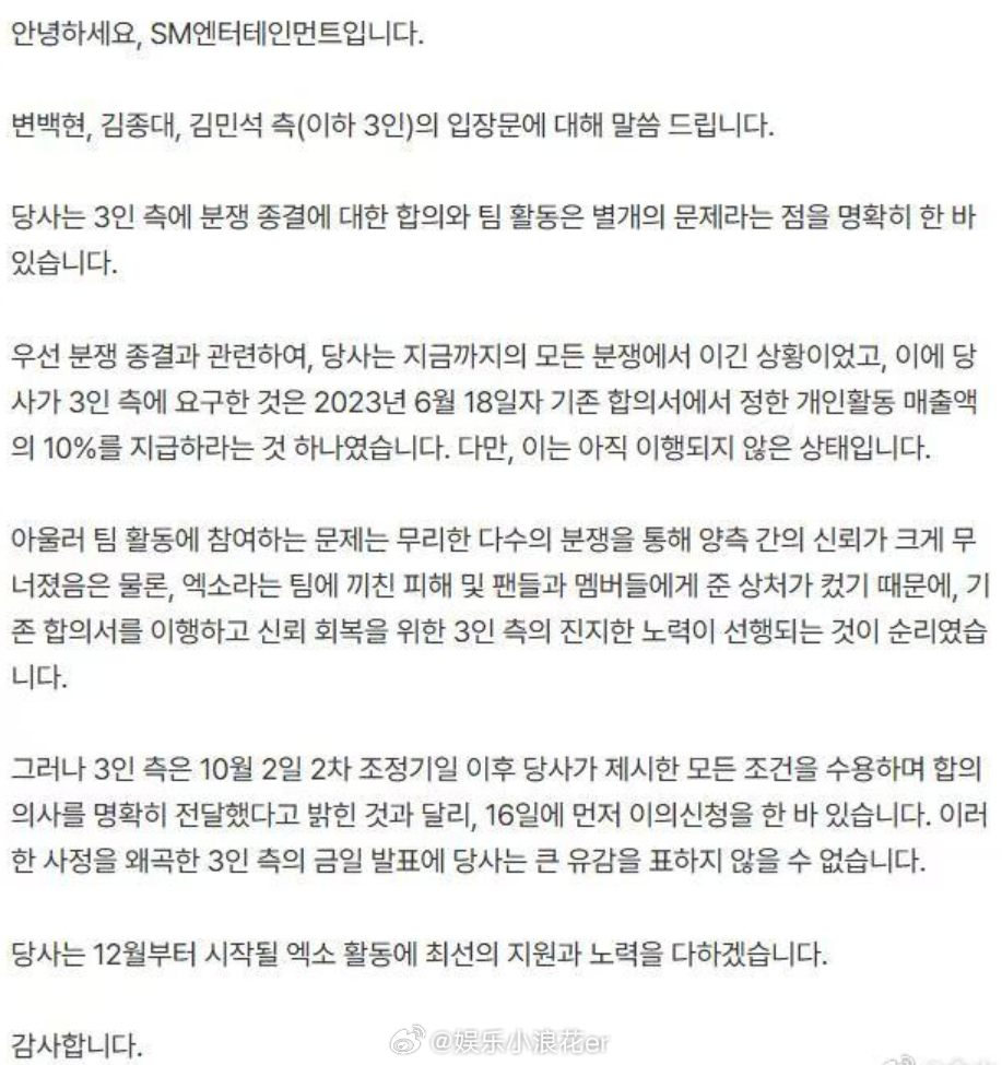 SM称CBX说谎SM称CBX应该先付钱再谈EXO活动 29日晚,SM侧针对CBX接受SM全部条件发布声明。SM称CBX与SM的纠纷和EXO大队活动是两个不同的问题。关于纠纷:SM已经在相关诉讼中胜诉,唯一的要求是按照23年的合同支付个人活动销售额的10%,但这点CBX并未履行。关于团队活动:SM强调由于双方信任破裂,EXO成员及粉丝都收到了巨大伤害,CBX应该先履行合约,再谈EXO团体活动。