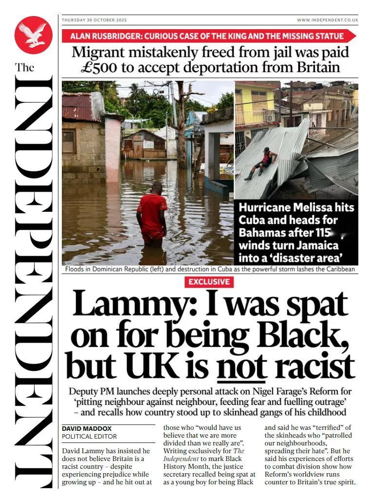 《独立报》头版报道称 ,飓风梅丽莎是2025年10月28日登陆加勒比海的五级飓风,其强度达到17级以上。 强大风暴袭击加勒比地区时古巴,又以每小时115英里的速度前往巴哈马群岛 ,进入“灾区” 多米尼克共和国遭受洪水(左图),许多加勒比海国家遭到破坏 , 狂风席卷牙买加。