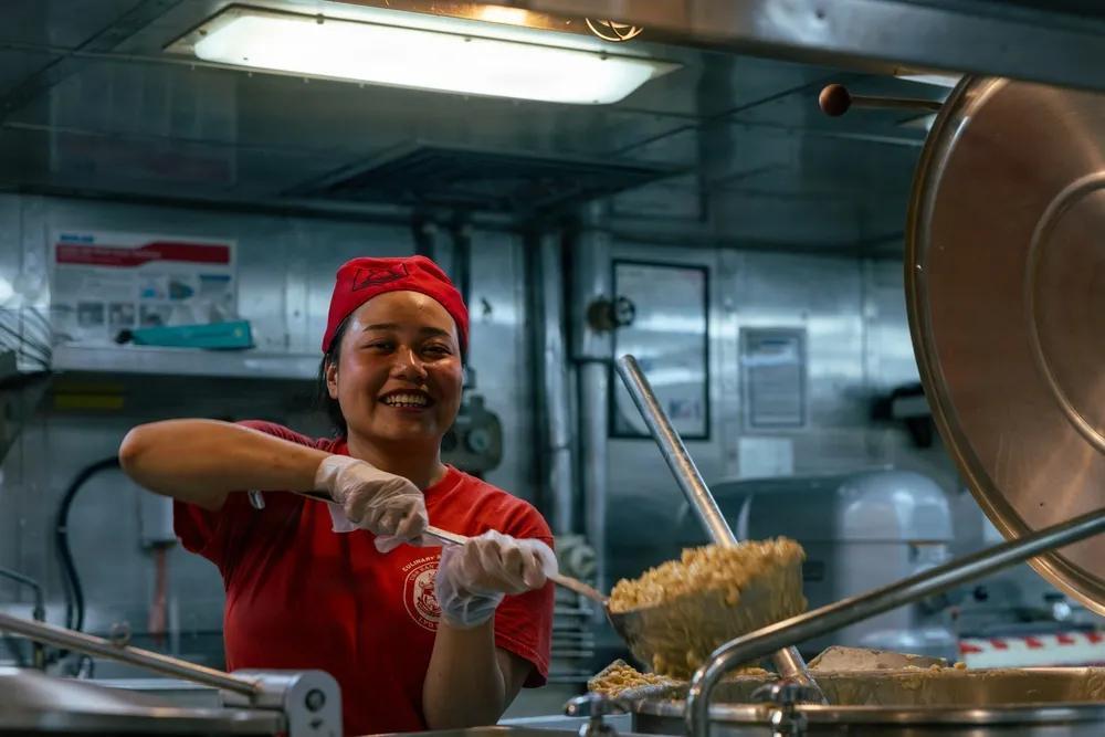2025年10月12日,美军圣安东尼奥级两栖运输舰“圣安东尼奥”号(USS San Antonio, LPD 17)、硫磺岛两栖准备大队,担任厨师的士兵,在加勒比海航行期间在船上准备晚餐。美国军队部署到加勒比海,以支持美国南方司令部的任务、国防部指示的行动,以及总统打击非法毒品贩运和保护国家安全的优先事项。