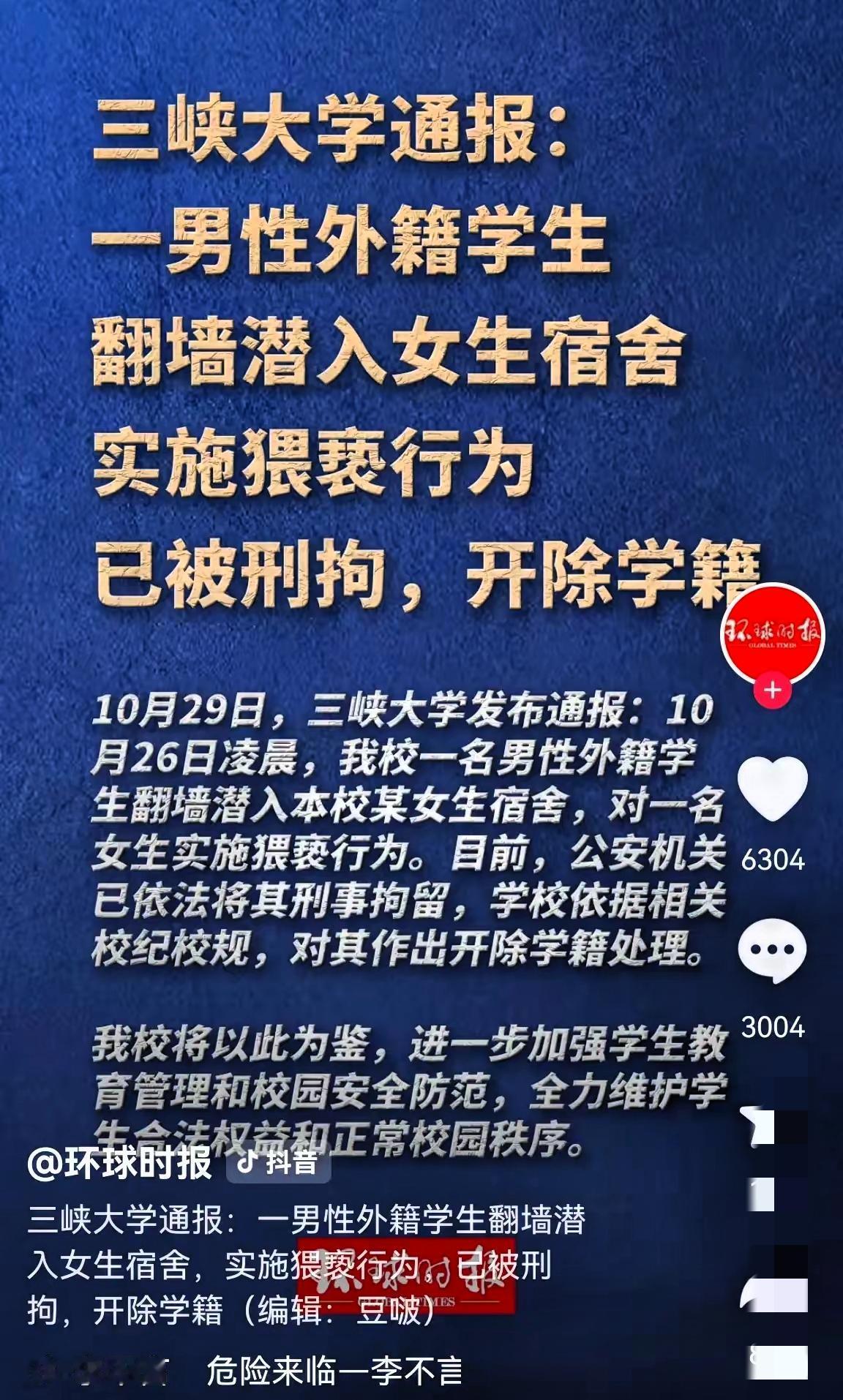 留学生闯女寝被拘:遮遮掩掩比案件本身更刺眼 凌晨徒手爬进女寝作案,学校先封消息再慢半拍通报,这波操作比案件本身还让人窝火!三峡大学这事儿,从26号凌晨事发到29号声明,三天沉默全靠网友追问才打破[__LINK_ICON]。 有人纠结猥亵和强奸未遂的界定,其实法律早有说法,主观意图和行为程度是关键,但大家真正在意的,是那藏不住的"特殊化"心思。留学生公寓装电子围栏,女寝却连防爬设施都没有,出事先捂嘴不是护学生,是护面子。 说什么怕影响国际形象,恰恰是这种遮遮掩掩,才让"超国民待遇"的猜测发酵。我国法律早明确,外国人犯罪没特权,该刑拘刑拘,该驱逐驱逐[__LINK_ICON]。真正的国际化,是安保一视同仁,处理不搞双标。 现在铁丝网装了,人也拘了,但信任破了咋补?你觉得校园安全该先防外人还是先堵消息?