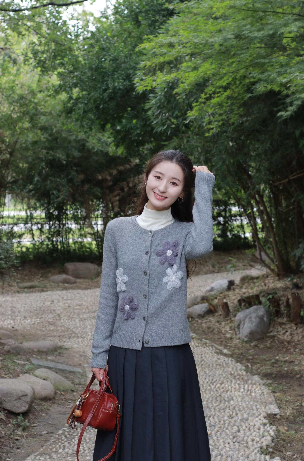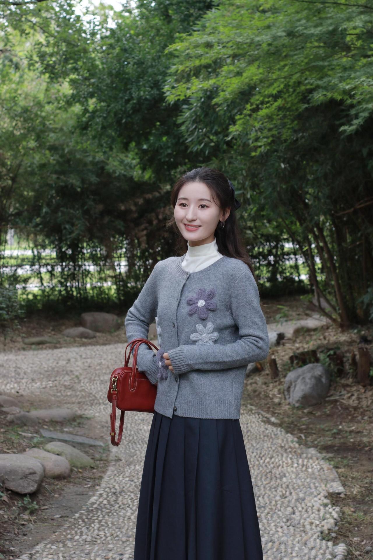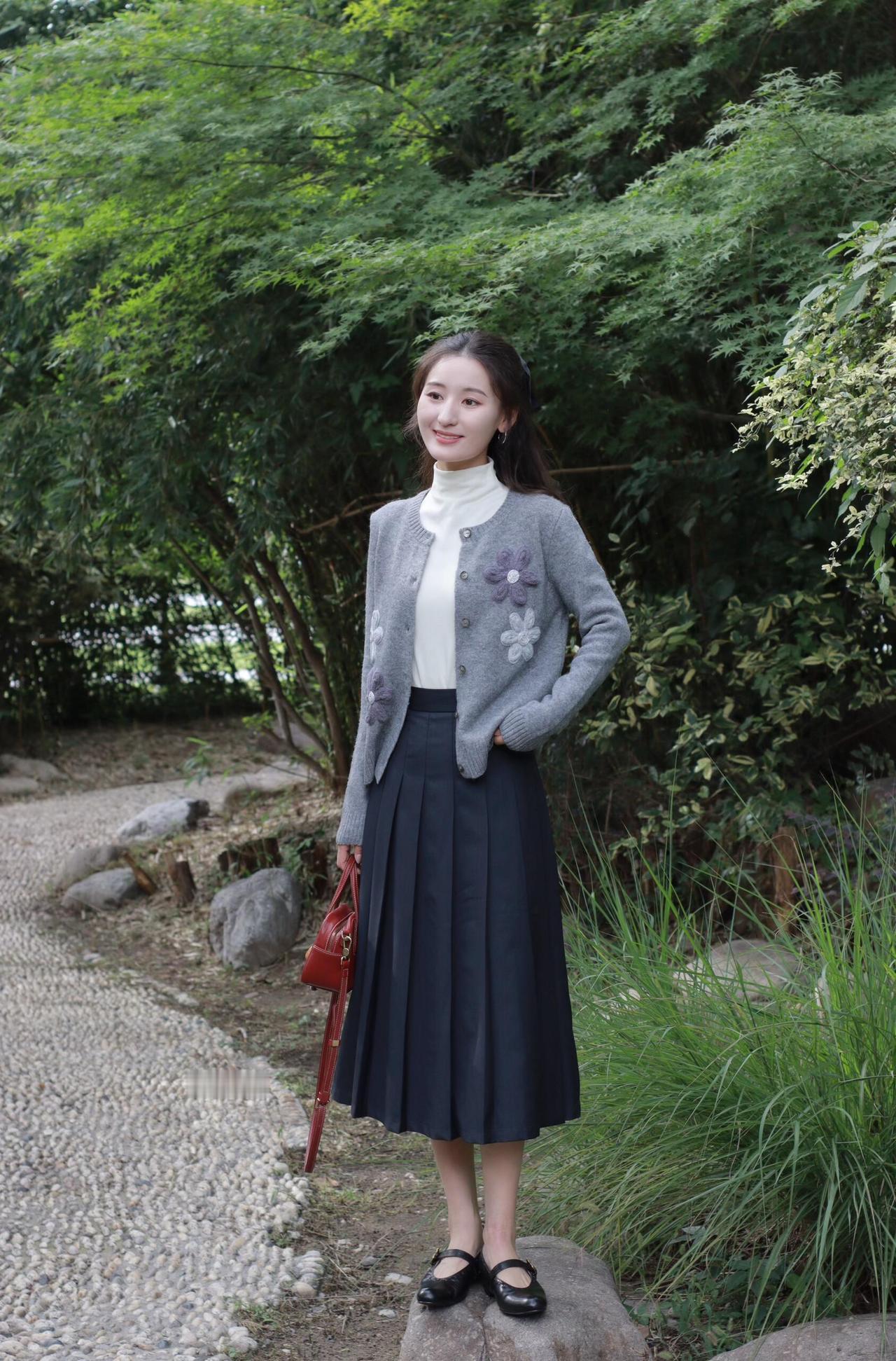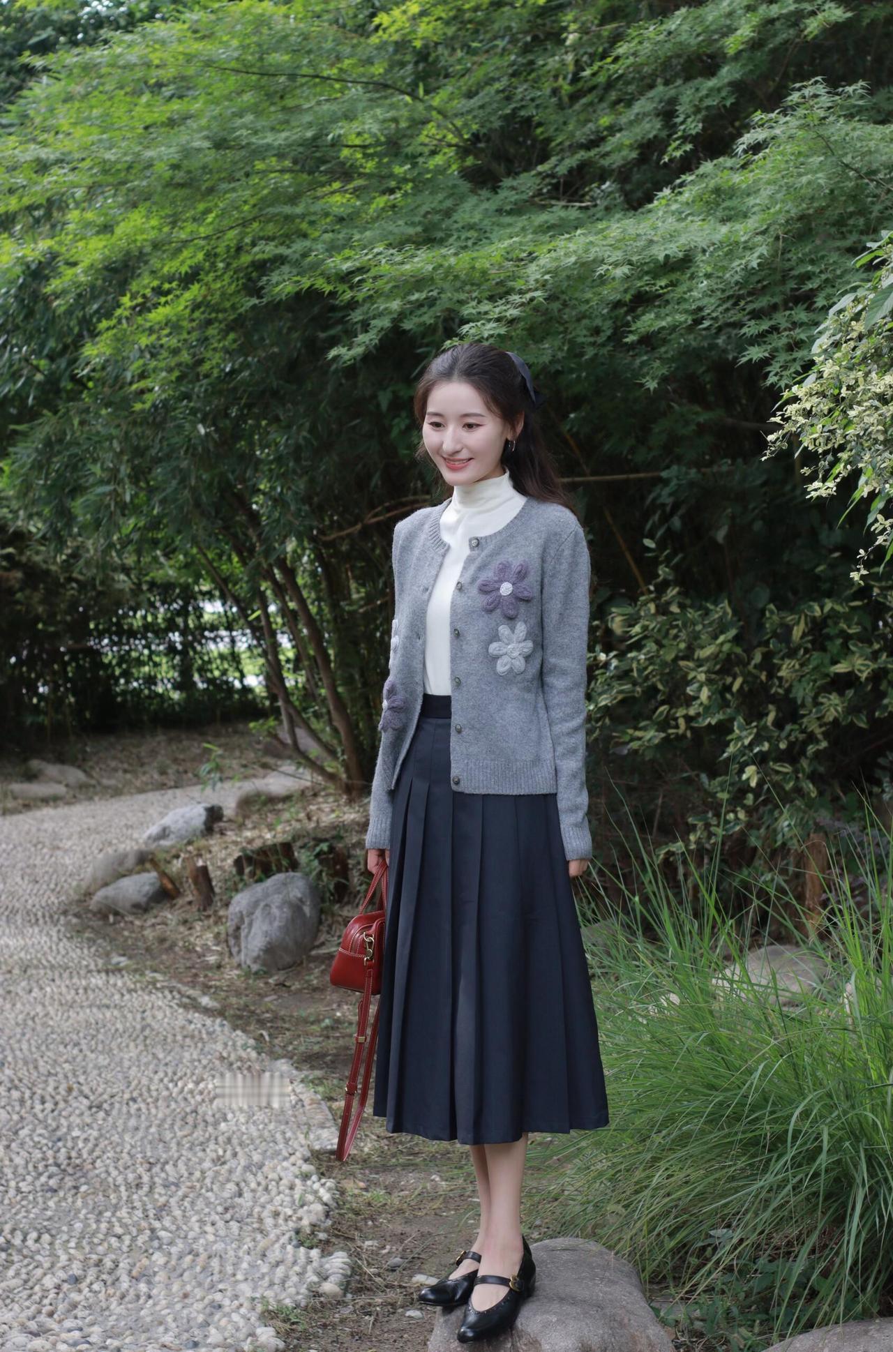 秋日穿搭指南灰色毛衣+深蓝长裙搭配红色手提包优雅出街简约风穿搭