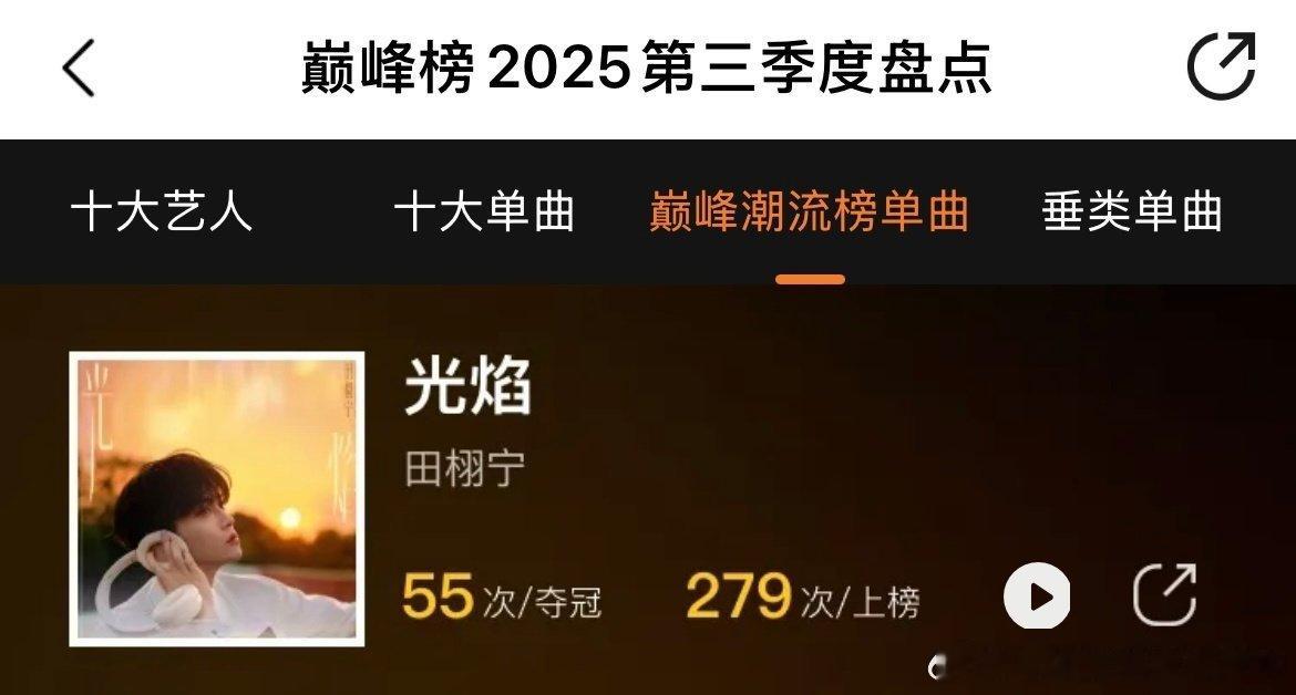 田栩宁的《光焰》成为2025第三季度巅峰潮流榜十大单曲之一