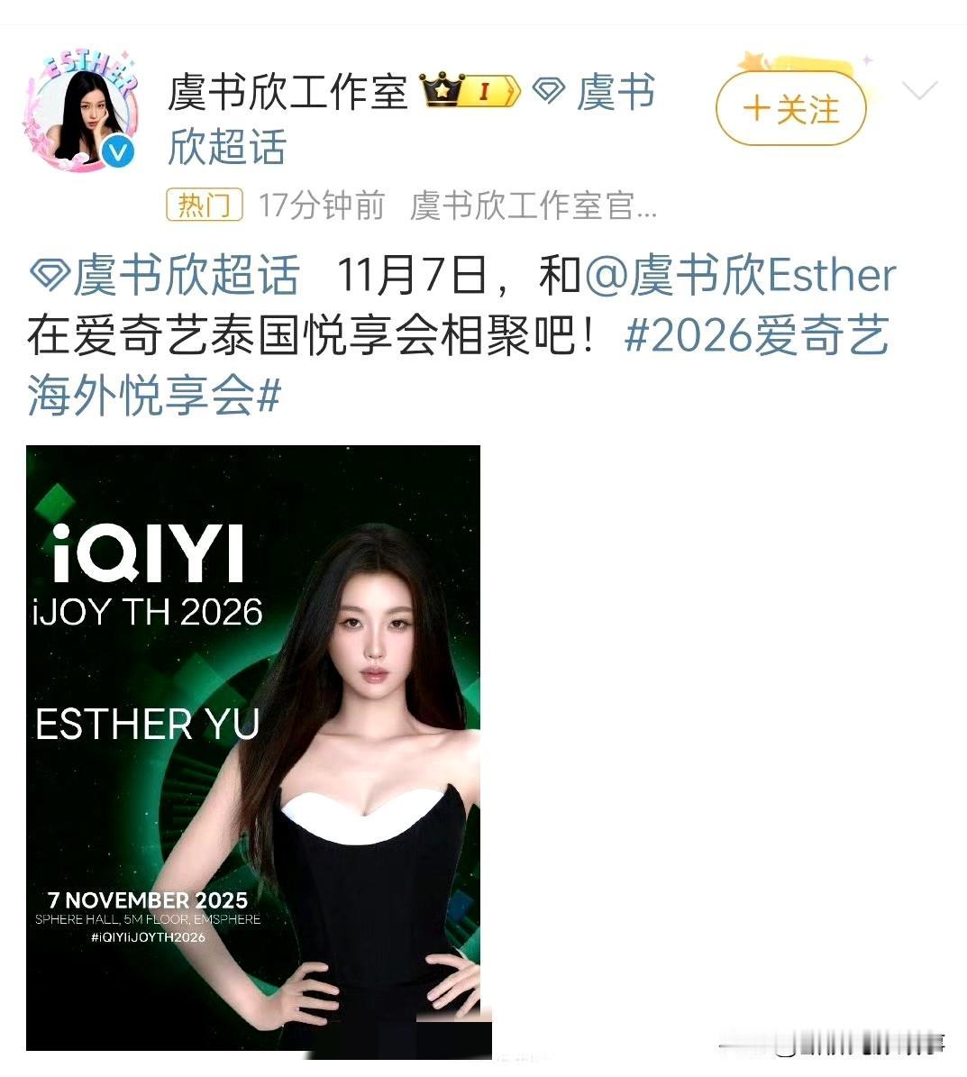 虞书欣官宣爱奇艺泰国悦享会:活动行程逐步回归常态 虞书欣工作室官宣其将出席11月7日的2026爱奇艺泰国悦享会,这一公开行程也被视为她活动节奏回归常态的信号。 此次海外活动是她近期公开的重要行程之一,从官宣海报的造型来看,状态在线,也让观众对其后续的作品宣发、公开活动安排更添期待,后续或有更多线下、海外行程逐步释出。