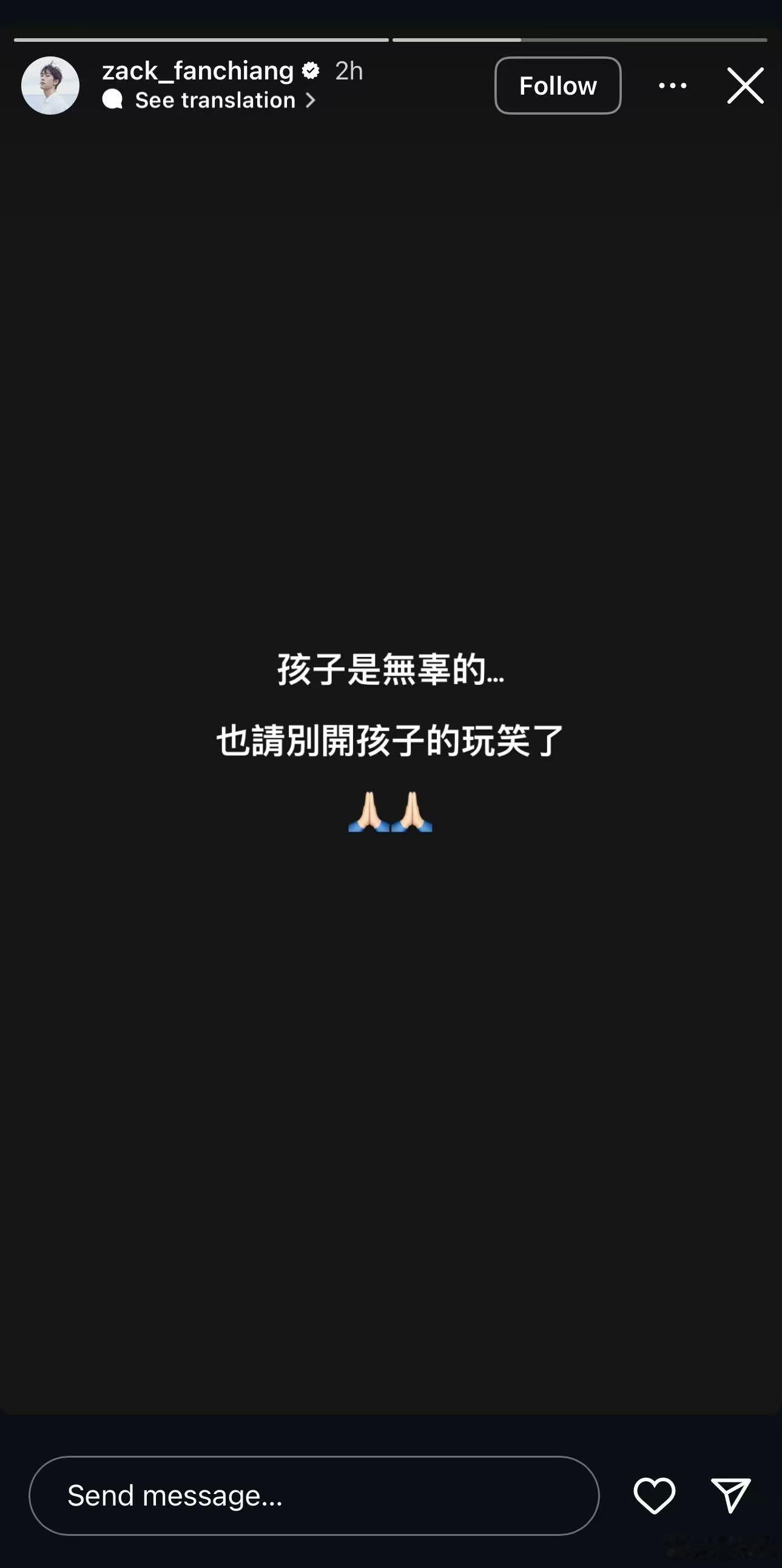 范姜彦丰再发声范姜彦丰 别开孩子的玩笑 曝妻子出轨后范姜彦丰在IG再发声:孩子是无辜的,也请别开孩子的玩笑。