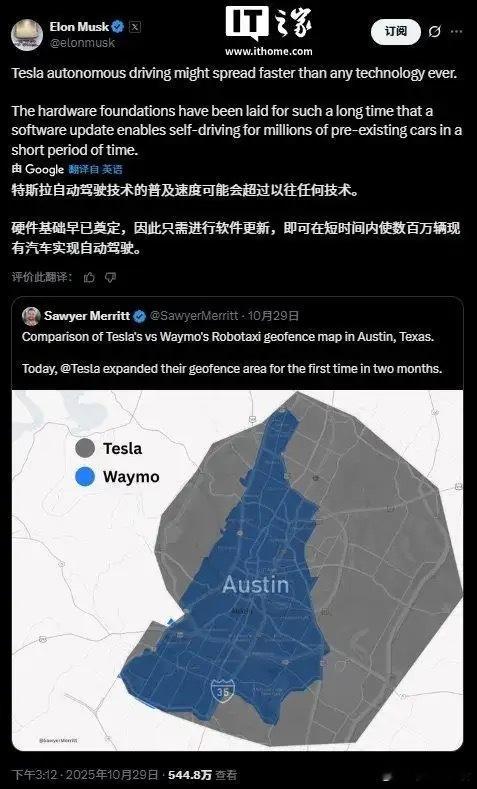 马斯克此番言论是回应行业观察者索耶·梅里特发布的图表。图中显示,特斯拉在奥斯汀的Robotaxi服务区域远超Waymo的覆盖范围。