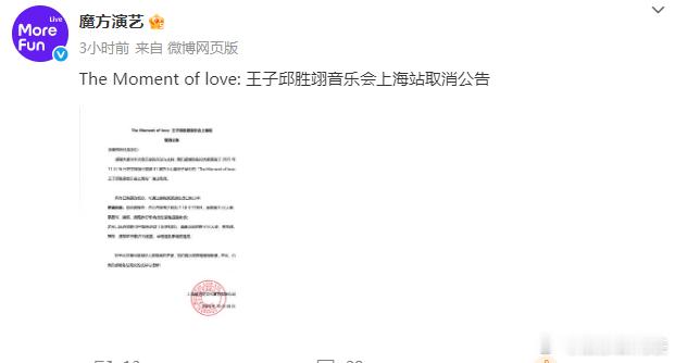 王子上海演出取消 29日公开点名介入他与粿粿的婚姻。王子形象一落千丈,不仅原定11月1日出席一日店长活动证实已经取消,上海的音乐会稍早也宣布取消。主办单位表示:“感谢大家对本次音乐会的关注与支持,我们遗憾的告知大家,原定于2025年11月16日在交通银行前游31演艺中心里匣子举办的‘The Moment of ove王子邱胜翊音乐会上海站’演出取消。所有已购票的观众,可透过原购票管道处理已购订单。”