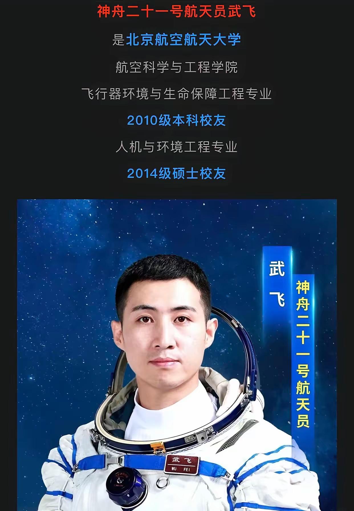 北航这是要疯啊! 刚看新闻推送,神二十一航天员简介,又一个北航毕业生?!我没记错的话这个学校出了起码有三个航天员了吧?前两年的桂海潮,今年年初神二十的王杰,再到这次的武飞,都是北航毕业的,真行,真厉害,你还别说这小伙子长得还真精神。 网友纷纷留言: 你要这么说的话,那这些航天员大部分都是长春的空军航空大学毕业的。哈哈 北航这哪是学校啊,分明是“航天员孵化基地”,输出速度也太快了! 没必要吹捧,这个学校就是干这个的!如同农民种地,种的多好也没必要过分夸赞。