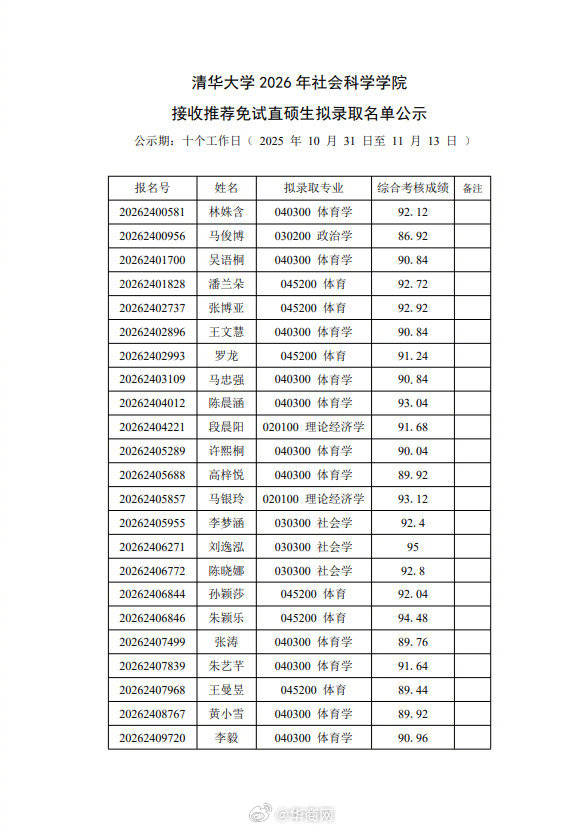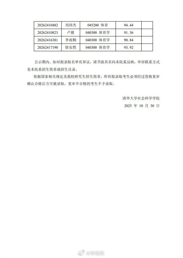 【#孙颖莎拟录取清华大学硕士#】#王曼昱拟录取清华大学硕士# 10月30日,清华大学2026年社会科学学院接收推荐免试直硕生拟录取名单公示,乒乓球运动员和进入拟录取名单。 #孙颖莎王曼昱被清华免试录取#