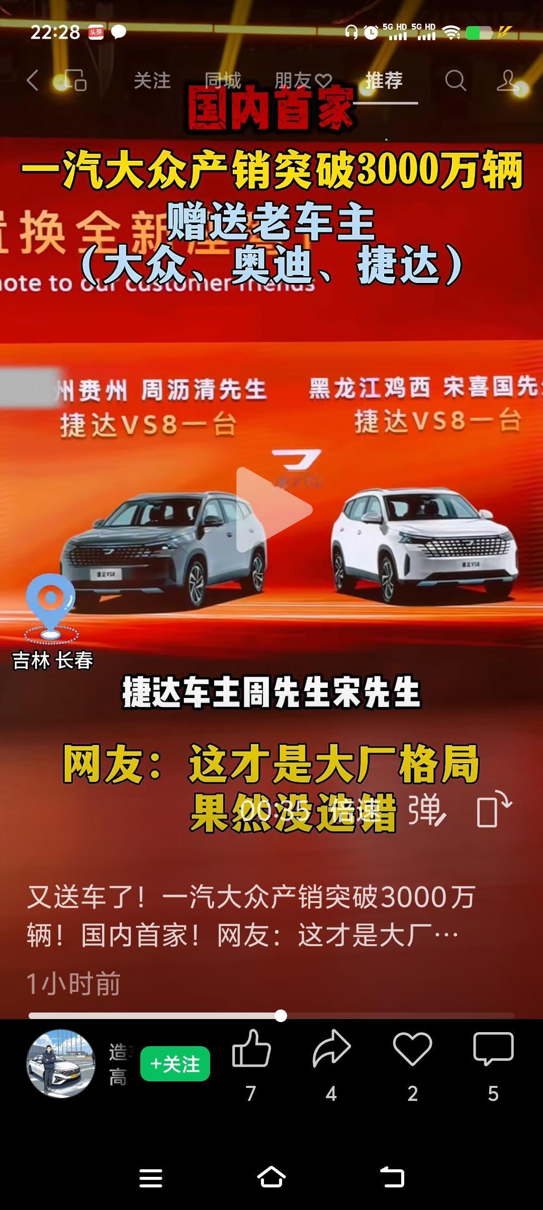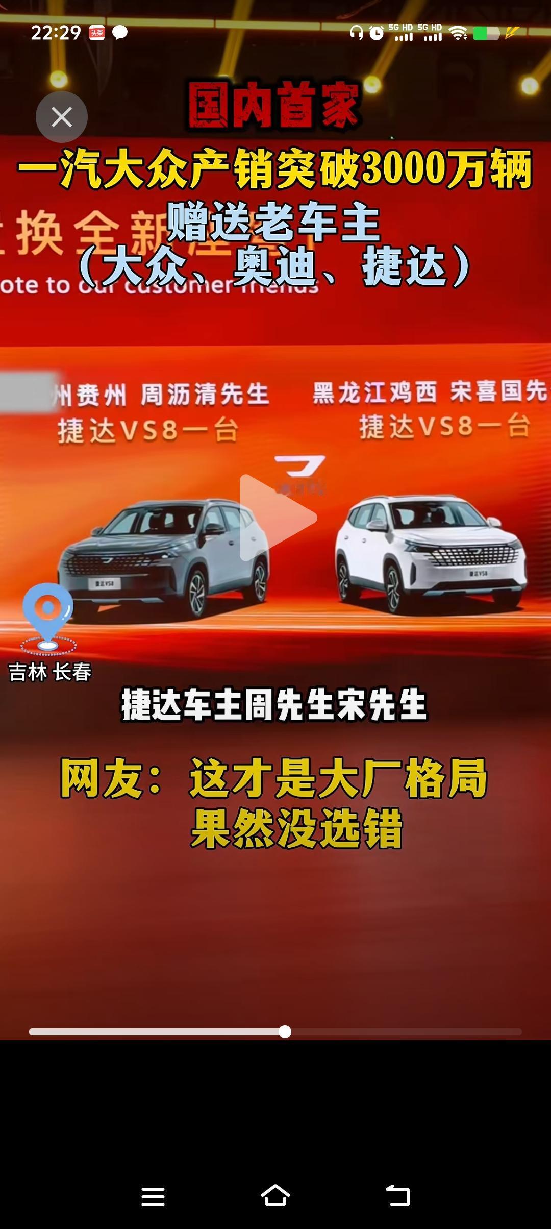 看见没有,搞营销,谁也干不过大众。 一汽大众为了庆祝产销3000万台,搞了一个回馈老客户的活动,直接随机抽取幸运车主,免费送新车! 这次免费送出的新车有捷达、大众和奥迪,本次最幸运的人收到了一台崭新的奥迪A5。不得不说,大众这波操作整得比任何广告都要有感染力。 网友说这才是大厂风范,大众都这么搞了,其他合资品牌,国产品牌敢不敢跟进?