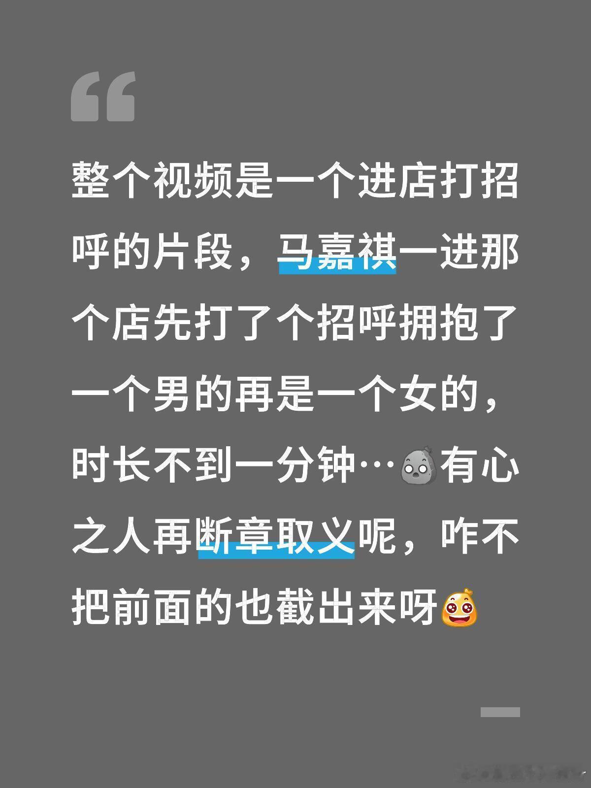 整个视频是一个进店打招呼的片段,马嘉祺一进那个店先打了个招呼拥抱了一个男的再是一个女的,时长不到一分钟…有心之人再断章取义呢,咋不把前面的也截出来呀[哼] ​​​