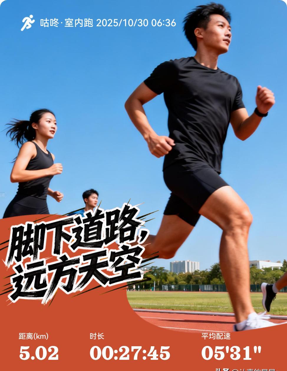 5公里27分45,配速5分31,心率132,不快不慢,刚好喘得上来,腿还带劲儿。 这叫跑步? 不,这叫给身体发红包——不逼自己,但也不偷懒。 秋天早上凉飕飕,跑起来不冒汗、不打摆子,真舒服。 别总想着破纪录,能稳稳跑完,比冲线更重要。 一周来个一两回,别当任务,当晨间仪式。 跑完喝口温水,晒会儿太阳,日子就亮了。 你不是在练体能,你是在攒活气儿。