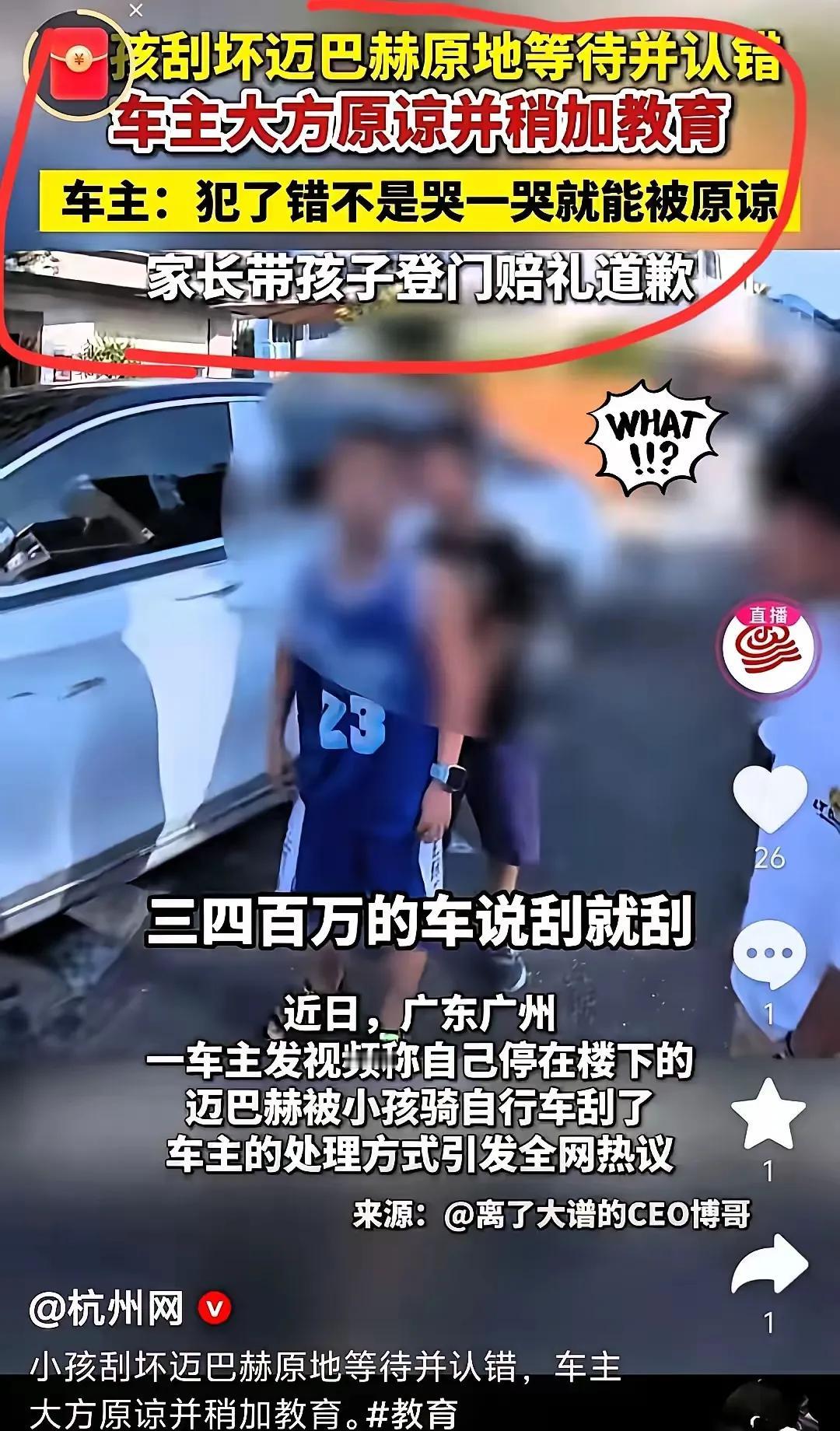 一位车主的迈巴赫被小孩骑自行车刮擦,小孩原地等待并认错,家长也带孩子登门道歉。 车主虽损失不小,却大方原谅,只对孩子进行了教育。他说:“犯了错不是哭一哭就能被原谅。”但最终,他只要求孩子买一瓶苏打水。 孩子懂事,孩子的父亲有担当,车主也大度,都该得到点赞。[赞][赞][赞] 家长和车主的做法,给孩子上了一堂生动的人生课:犯错要承认,责任要担当,宽容与理解能化解矛盾。希望这样的正能量能在社会中传递,让更多人学会担当与宽容。