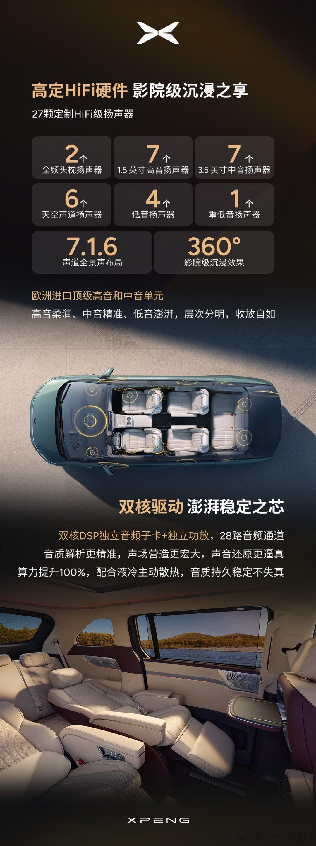 搭载27路HiFi扬声器,包括2个头枕、7高音、7中音、4低音、6天空声道及1个超重低音单元,支持7.1.6声道解码,配备双核DSP独立音频卡与独立功放,液冷散热保障长时间高负载运行。