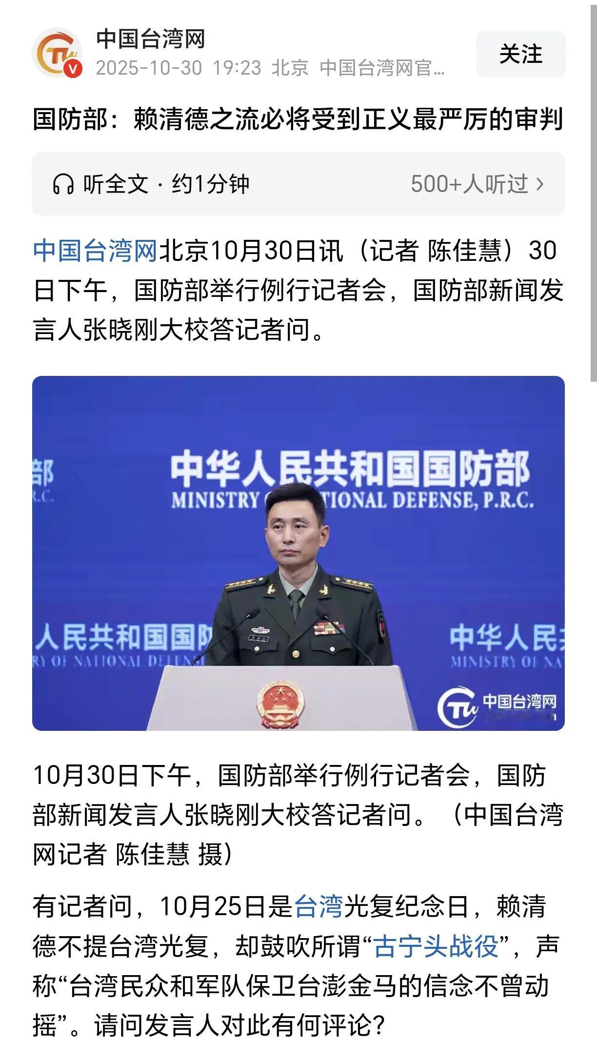 国防部直接公开点名,已以赖清德为首的台独分子未来的结局是注定的了。 尤其现在中美和谈,贸易战暂时不打了,又互相取消了关税贸易限制。 台湾地区的台独反统势力心中最大的依仗也不是那么牢靠了。其他诸如日本之类支持台独国家也就打打嘴炮,在解放军统一时派兵介入的概率是不大的。 台湾未来统一后,必须对当地的台独势力、黑帮邪教、顽固拒统分子进行彻底清算。