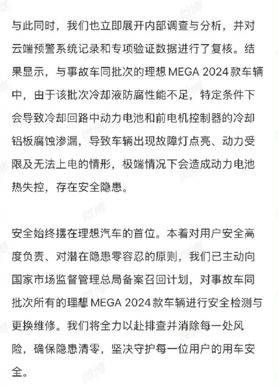 理想汽车最新公告,两个事: ①上海起火的理想MEGA 2024款,具体原因还未有定论。 ②针对生产日期从2024年2月18日至2024年12月27日的2024款理想MEGA 进行召回处理,更换全新动力电池及相关配套设备。 该批次召回车型冷却液防腐性能不足,在特定条件下,可能存在冷却回路中动力电池和前电机控制器的冷却铝板腐蚀渗透。导致车辆故障灯点亮、动力受限及无法上电的情形,极端情况下会造成动力电池热失控,存在安全隐患。【来自懂车帝车友圈】