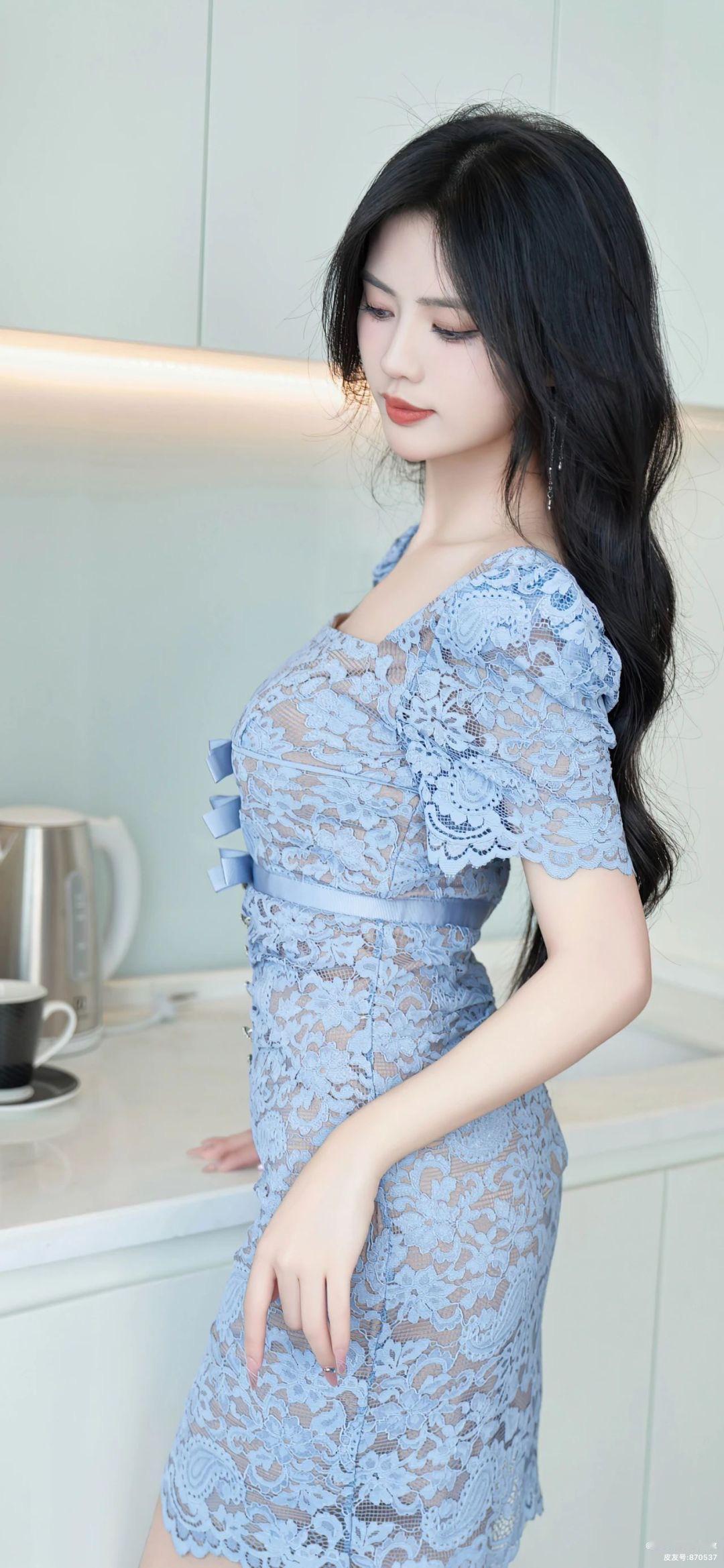 优雅蓝裙,气质满满,厨房里的时尚女神