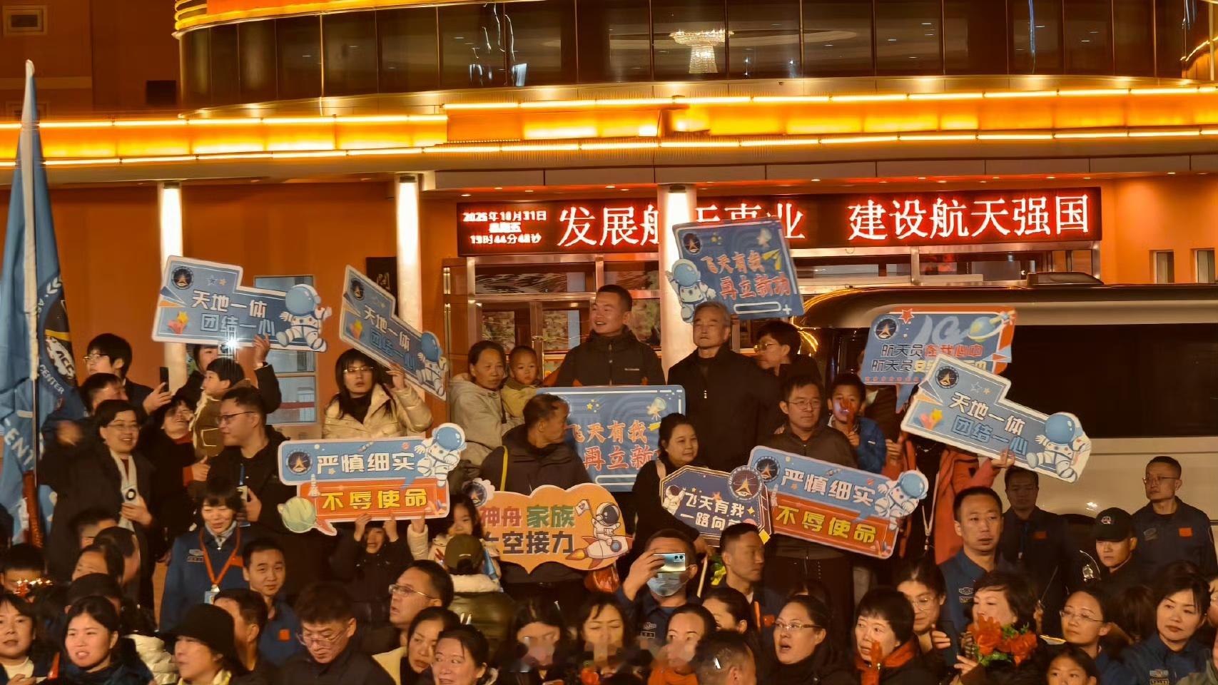 【被中国航天的应援牌硬控了[点赞]】神舟二十一号出征仪式即将开始,在现场,围观人群举起各种应援牌:严慎细心、不辱使命,神舟家族、太空接力……瞬间被硬控了!预祝发射成功!(