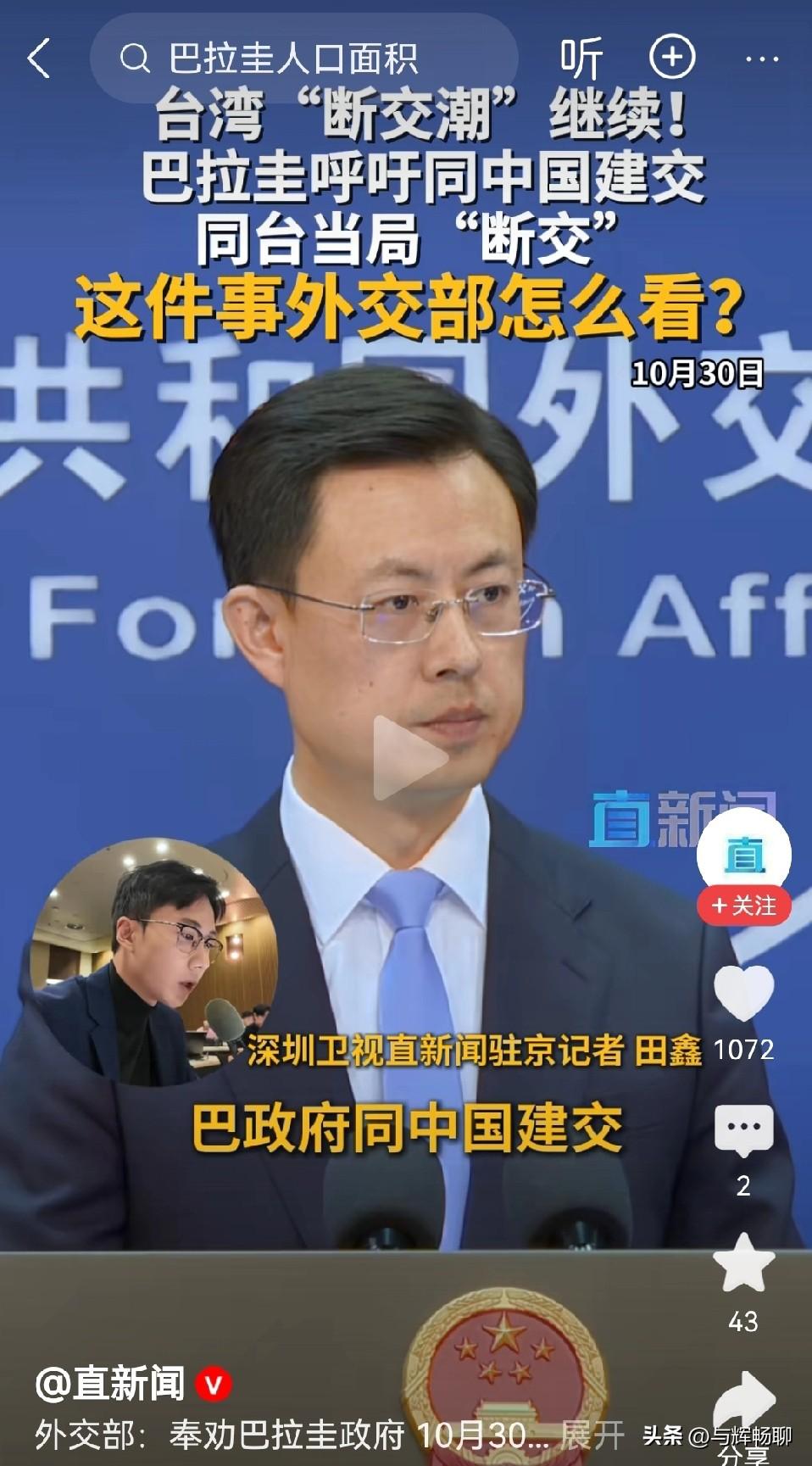 又传来好消息,在昨天外交部记者会上,外交部发言人就巴拉圭民众及议员呼吁同中国交建的问题阐述了观点。他表示乌拉圭民众有意愿同中国建交,也奉劝巴拉圭政府应倾听人民的呼声,早日改弦更张,做出正确的抉择。 大家都知道,截至2024年1月15日瑙鲁与台湾当局“断交”后,台湾当局所谓的“邦交国”数量已减少到12个,分别是帕劳、图瓦卢、马绍尔群岛、伯利兹、圣文森特和格林纳丁斯、危地马拉、海地、巴拉圭、圣卢西亚、圣基茨和尼维斯、斯威士兰、梵蒂冈。 看看这些国家就知道,都是一些又穷又小的国家,在国际上没有啥存在感,他们和台建交主要是为了获得更多经济利益,眼看着台独也蹦跶不了多久,早日同中国建交才是他们的正确抉择(图片来自网络)巴拉圭外交 巴拉圭外长 巴拉圭经济 巴拉圭建交 玻利维亚关系 中国秘鲁关系 巴拉圭访台 乌拉圭发展 阿根廷中国关系 。