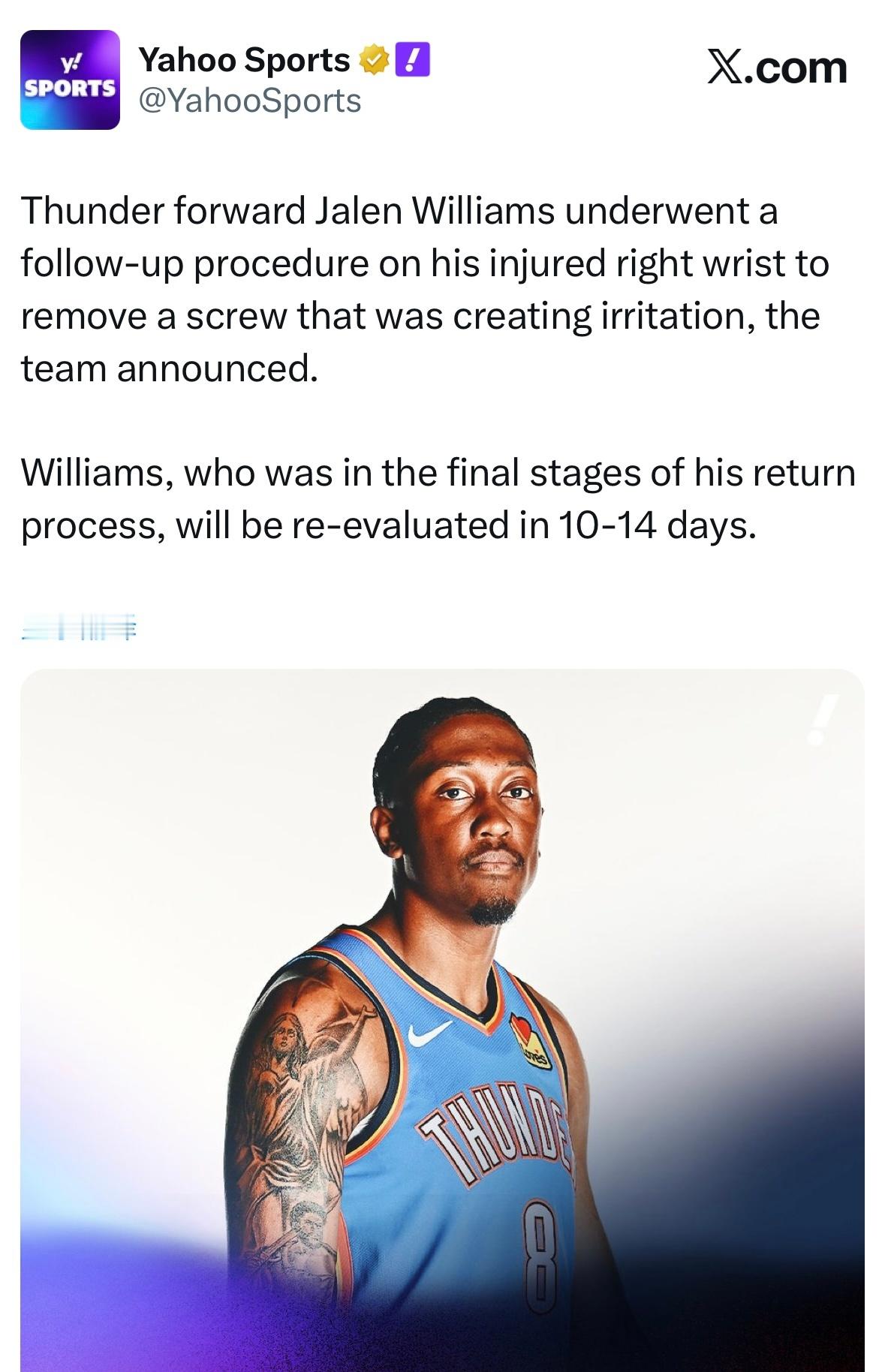 雷霆官方宣布,杰伦·威廉姆斯为移除引发不适的螺钉,对受伤的右手腕进行了第二次手术。