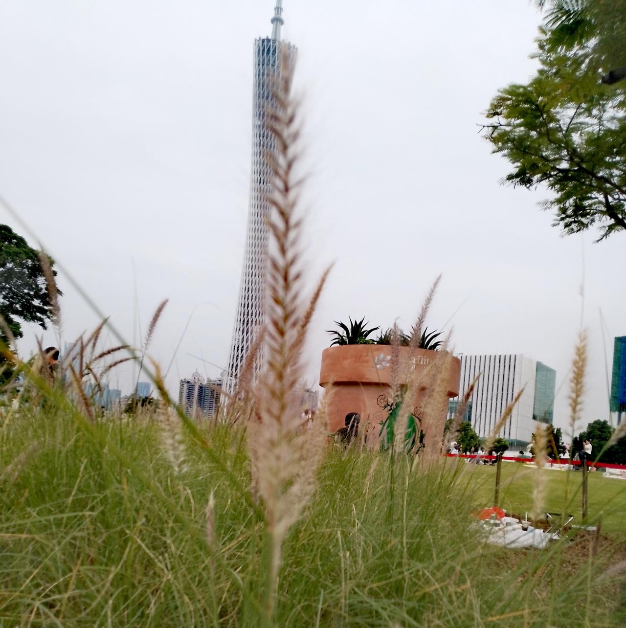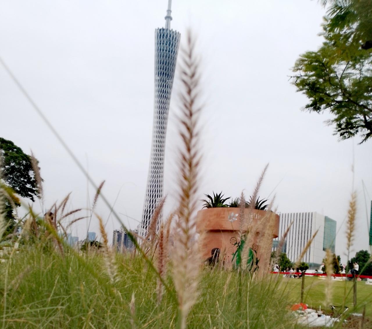 我帮小草完成一个心愿,它说想和广州塔合影,看看能不能超越广州塔?我努力地把小草扶好,拍了这个图片,看看小草差一点就超越广州塔了。