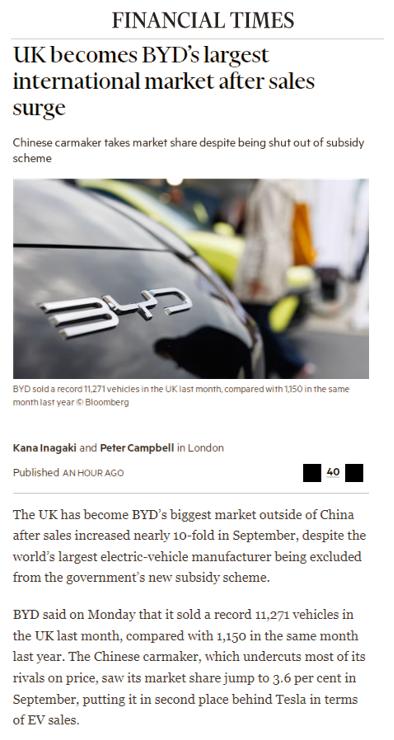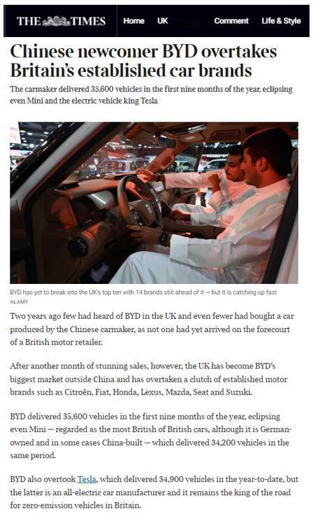 两年前几乎没人听过,两年后实现单一市场月销破万,被英国广播公司(BBC)、《泰晤士报》和《金融时报》三家英国主流媒体争相报道的比亚迪,到底做了什么? 2023年比亚迪勇闯英国市场,与特斯拉、Mini等一众知名汽车品牌同场battle,像一个小白一样无人知晓。但通过高频拜访经销商、打造店端活动样本等举措,快速引入完整的车型布局,知名度和销量节节攀升。 9月比亚迪在英国市场销量11271辆,在欧洲实现单一市场月销破万,同比增长880%,1-9月累计销量35604辆,同比增长576.9%,全市场销量直接超过特斯拉等品牌,从无人问津到炙手可热,比亚迪在中国车企出海的“必争之地”创下新的记录,完美诠释了什么叫“后来者居上”。 这几年比亚迪的出海行动越来越快,在成熟的英国市场能够取得这样的好成绩,与自身的技术实力是分不开的,更为中国车企提供“渠道深耕 + 本地化运营”的出海范本,朝着全球市场出发,每一步都算数。【来自懂车帝车友圈】