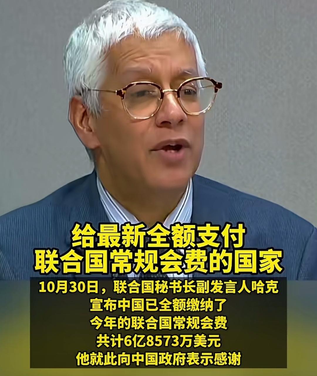 近日,联合国发言人哈克在新闻发布会上打趣表示:“有一个国家已经足额缴纳了今年的联合国会费,你们猜猜会是谁?” 紧接着他表示:“没错,你们猜到了,是中国!谢谢!” 中国足额缴纳了今年联合国会费,共计6亿8573万美元! 中国在联合国会费所占比重排在美国之后,世界排名第二位。 联合国会费分摊比重的依据是什么? 我查了一下,主要依据一个国家支付能力,包括这个国家的国民总收入人均收入外债,水平经济波动性。 我们国家缴纳的联合国会费从占比15%,提升到20%左右,主要是因为我们经济持续增长,占全球经济比重不断上升。 有意思的是,当初在审议提升中国会费时,我们投了赞成票,体现了大国责任和担当。 而美国长期拖欠联合国会费,总额甚至超过了30亿美元。 对比鲜明。 为了防止单一国家负担过重,联合国对会费设置了上限,分摊比重最高为22%,目前只有美国是这个标准。下限为0.001%,相当于象征性的给一点。 有意思的是,2025年联合国会费分摊排名,美国虽然排第一,但至今仍然没拖欠状态。 而五常国家,只有英国以3.99%勉强挤进前五,法国紧随其后,排名第六。 俄罗斯则以2%排名第10,是五常国家中排名最靠后的一个。 而一直嚷着要进五常的印度,以1.1%排名第17,还没墨西哥高。 大家看明白了吧,还是以经济发展水平为主要依据。