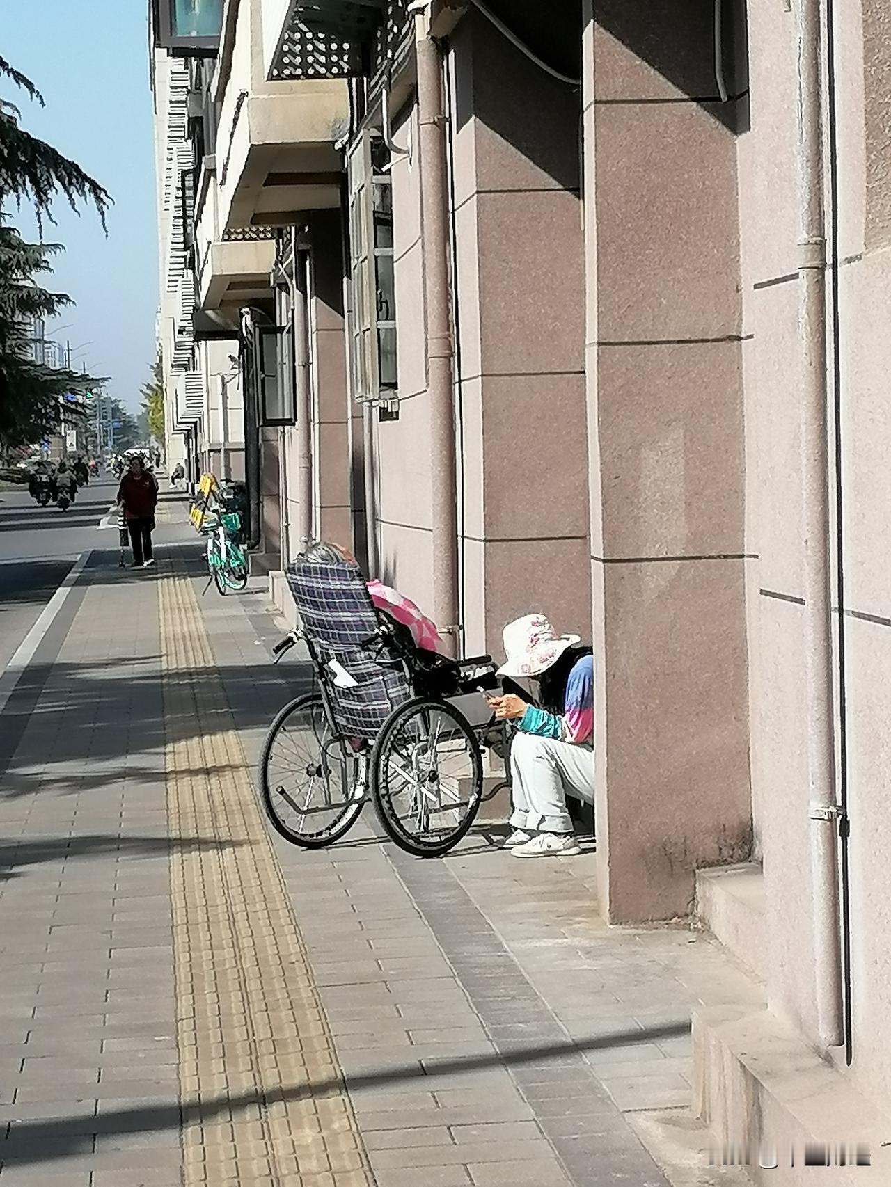 这一幕,着实扎心! 女子推着老人晒太阳,那老人仿佛陷入了沉睡,女子只好坐在地上,摆弄着手机。看得出,她满心不悦。据旁人说,她不工作,就这样陪着母亲,一晃已过二十余载! 她母亲九十多岁,七十岁起便生活无法自理。那她自己的家庭状况如何?她顾不上了,连属于自己的幸福时光也消逝殆尽。瞧她坐在地上那无奈的模样! 实际上,中国已然步入老年社会,高龄老人日益增多,他们生活不能自理,疾病缠身,却只能依赖子女照料,子女的幸福时光、大好的奋斗年华,或许就这样被消耗掉了。这种情况在过去并不多见,如今却已屡见不鲜!