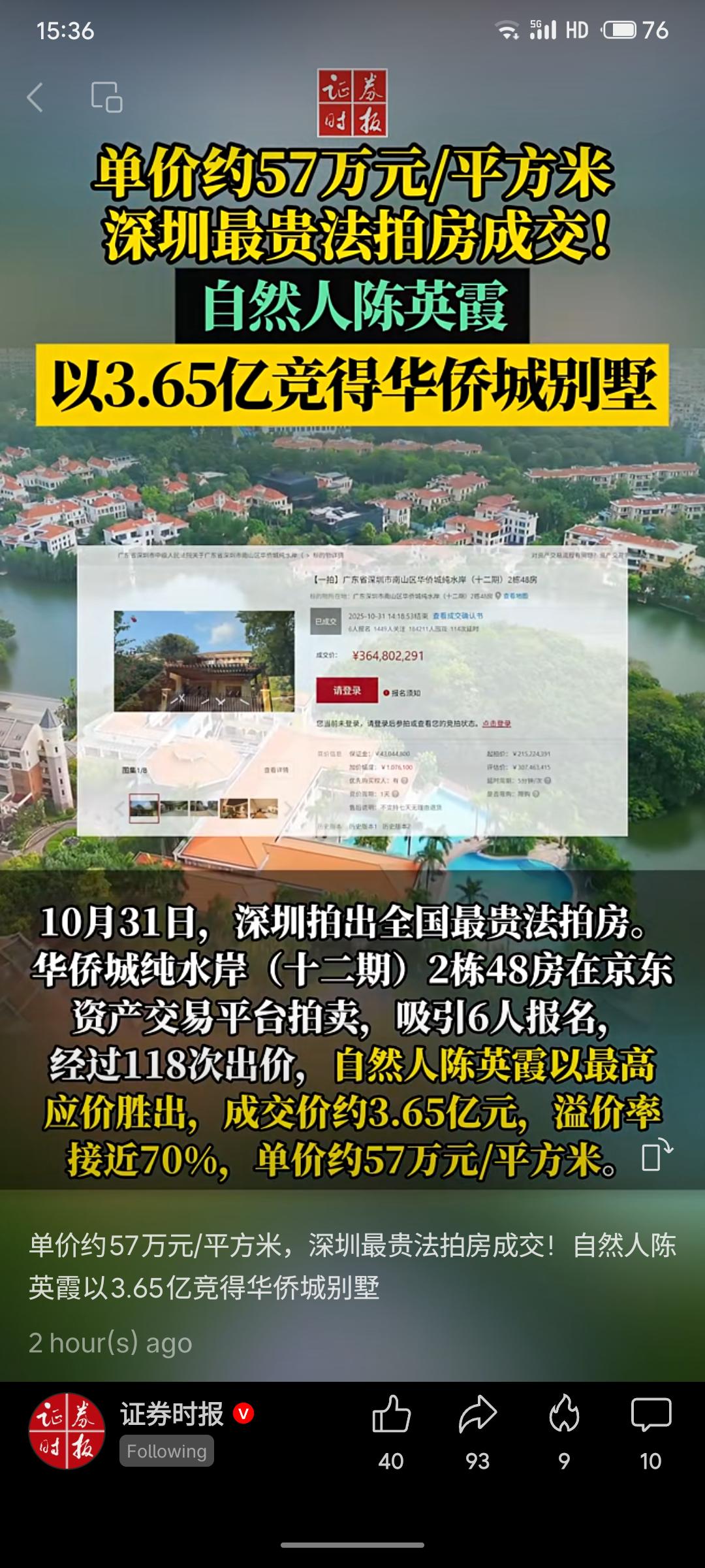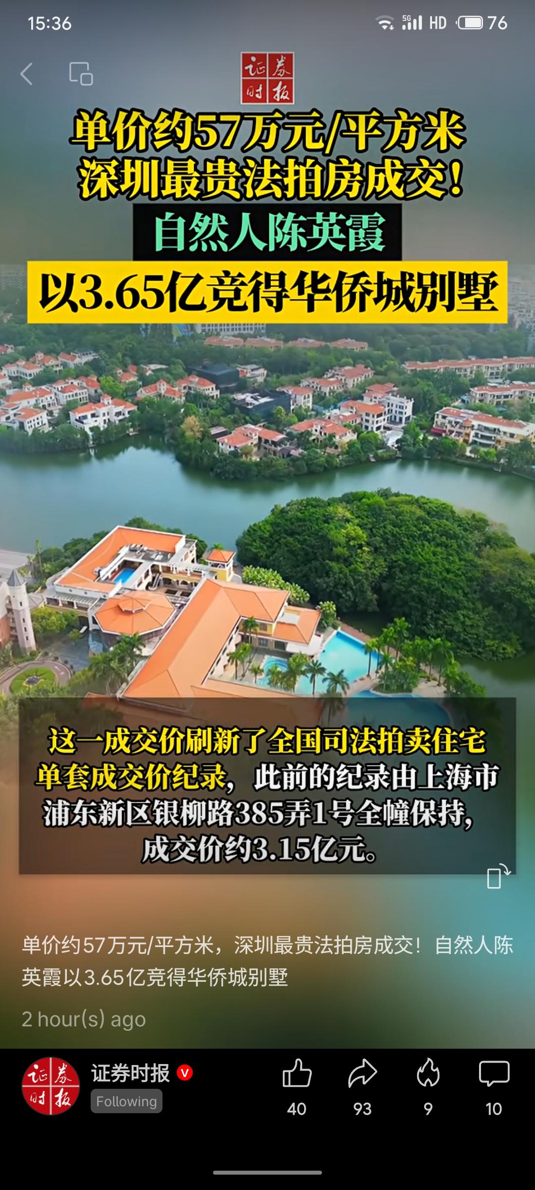 深圳华侨城纯水岸一栋别墅经法拍以3.65亿元成交,单价高达约57万元/平方米,创下全国法拍住宅单套纪录。该房产由自然人陈英霞竞得,其成交价超出此前上海保持的3.15亿元纪录。