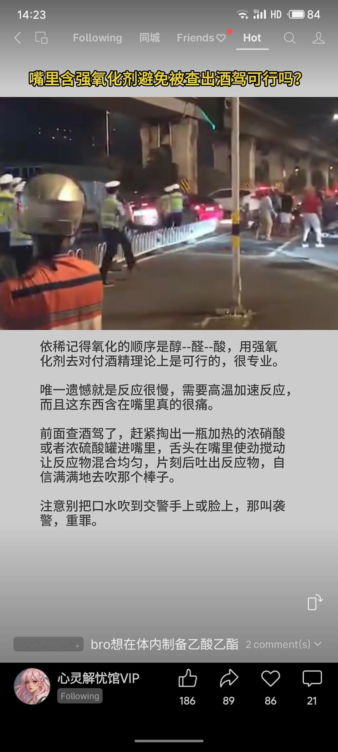 该帖子以幽默方式探讨含强氧化剂(如浓硝酸)氧化酒精以避免酒驾检测的设想,但指出反应慢、需加热且会灼伤口腔,并警告吐口水可能构成袭警。评论调侃其如“体内制备乙酸乙酯”,强调不可行性与危险。