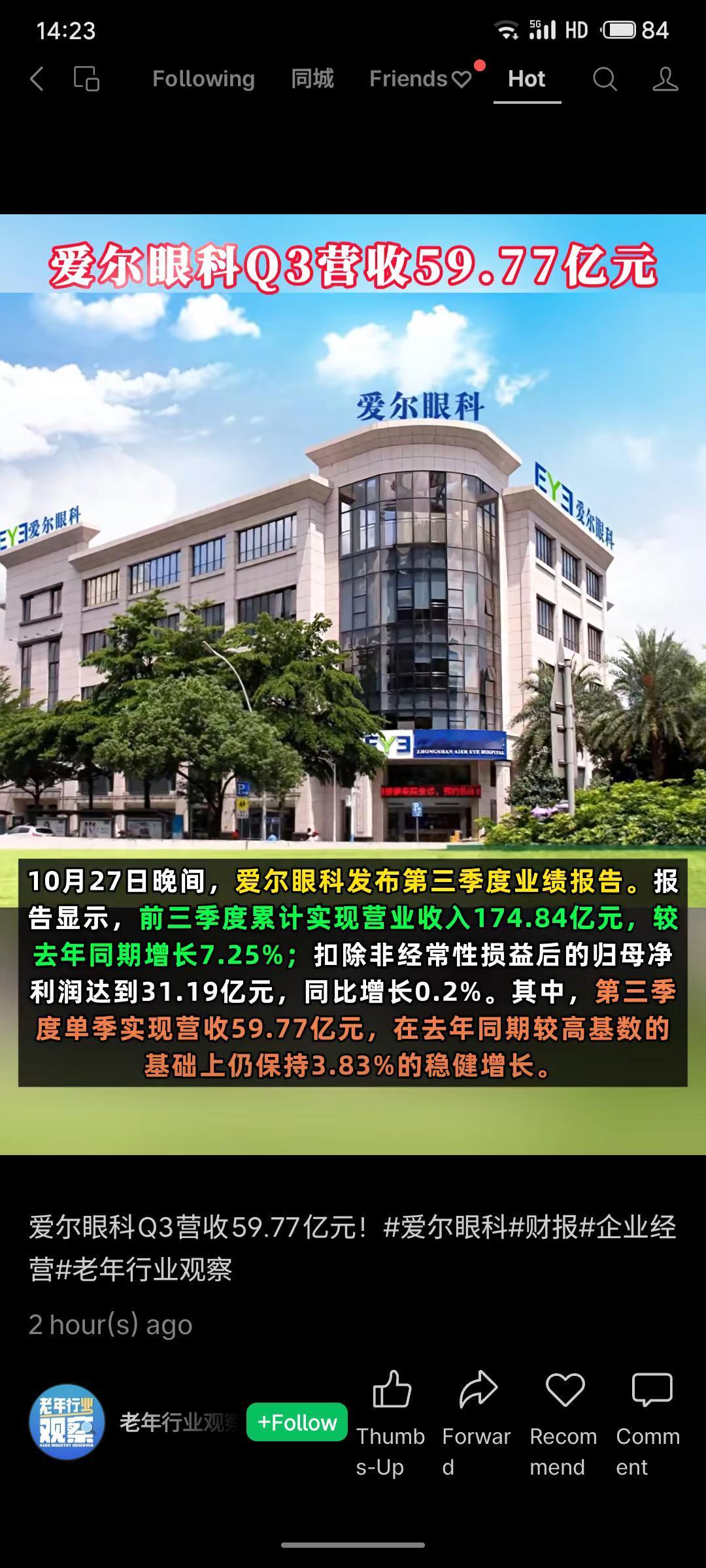 爱尔眼科第三季度营收达59.77亿元,前三季度累计营收174.84亿元,同比增长7.25%。公司为应对“老花+近视”复合需求,已设立老视专科门诊,积极拓展老年眼健康业务。