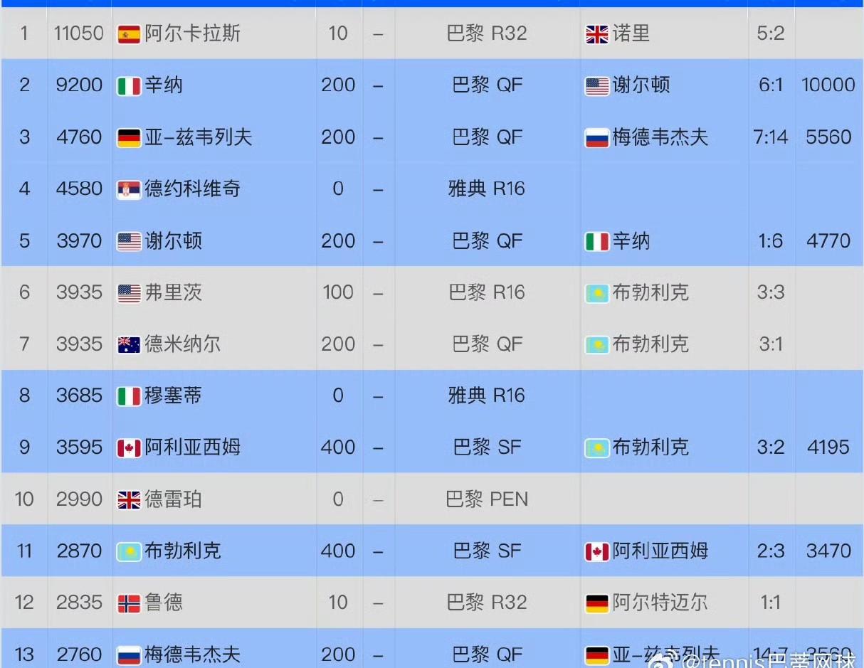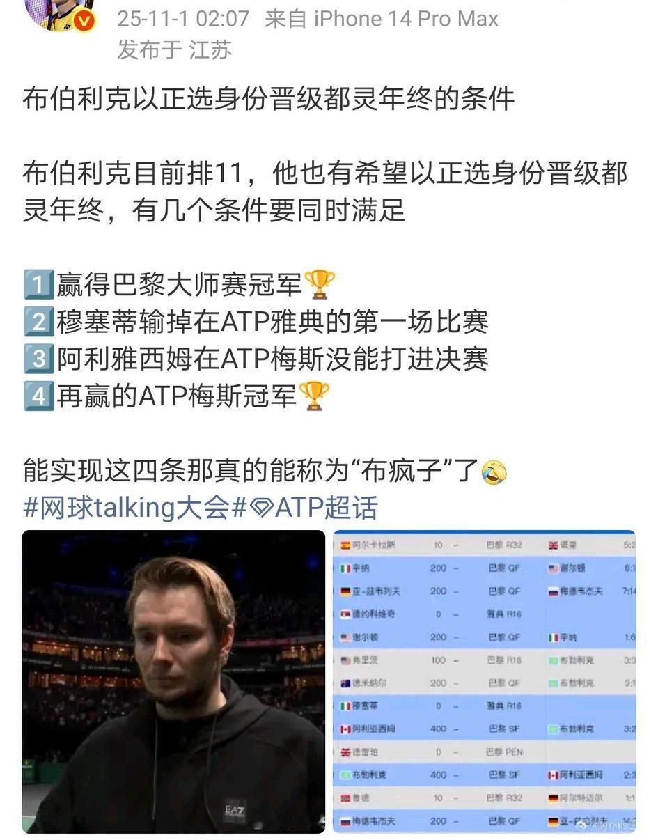 随着阿利亚西姆、布勃利克都打进巴黎大师赛四强,他们也开始向往总决赛了。 由于德约科维奇并没有宣布不参加总决赛,穆塞蒂、阿利亚西姆就不敢放松,FAA比穆塞蒂少90分,穆塞蒂申请了雅典250外卡,FAA则要去梅斯250参赛。 “布疯子”也来凑热闹,只要能在巴黎大师赛和梅斯250赛夺冠,并且阿利亚西姆没能晋级梅斯赛决赛,那么这一切将成为现实。