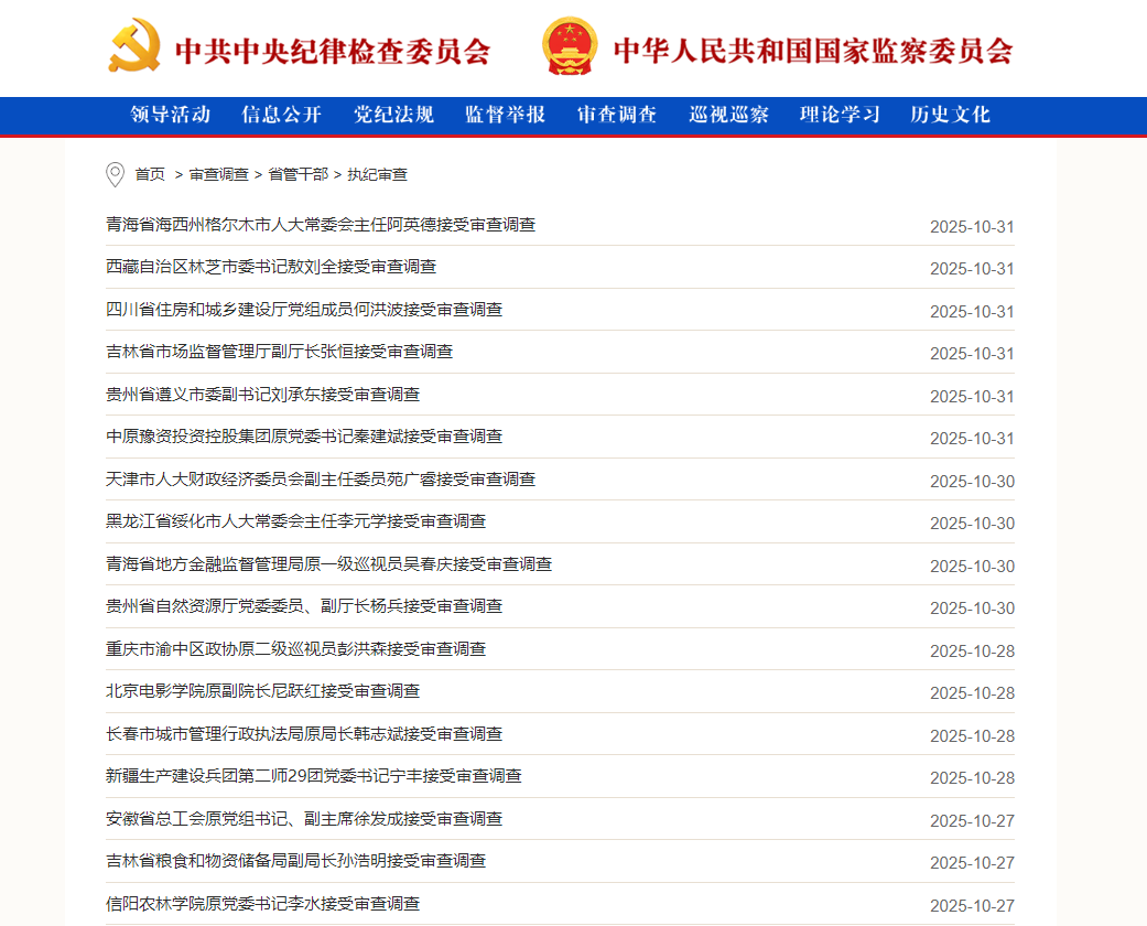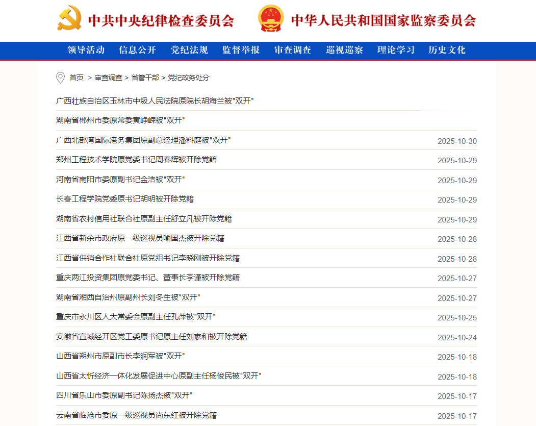 此外还有:广西壮族自治区玉林市中级人民法院原党组书记、院长胡海兰被开除党籍和公职,湖南省农村信用社联合社原党委委员、副主任舒立凡被开除党籍,重庆两江投资集团原党委书记、董事长李谨被开除党籍,大连海关原党委书记、关长刘大立被开除党籍和公职,中国中纺集团有限公司原党委书记、董事长刘云被开除党籍和公职,等等。
