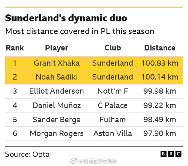 【跑不死】根据OPTA的数据统计,本赛季英超联赛前9轮,只有两名球员的累计跑动距离,超过100公里(场均超11公里),他们正是桑德兰的首发双后腰,扎卡和萨迪基,这也是黑猫成绩理想的原因之一。