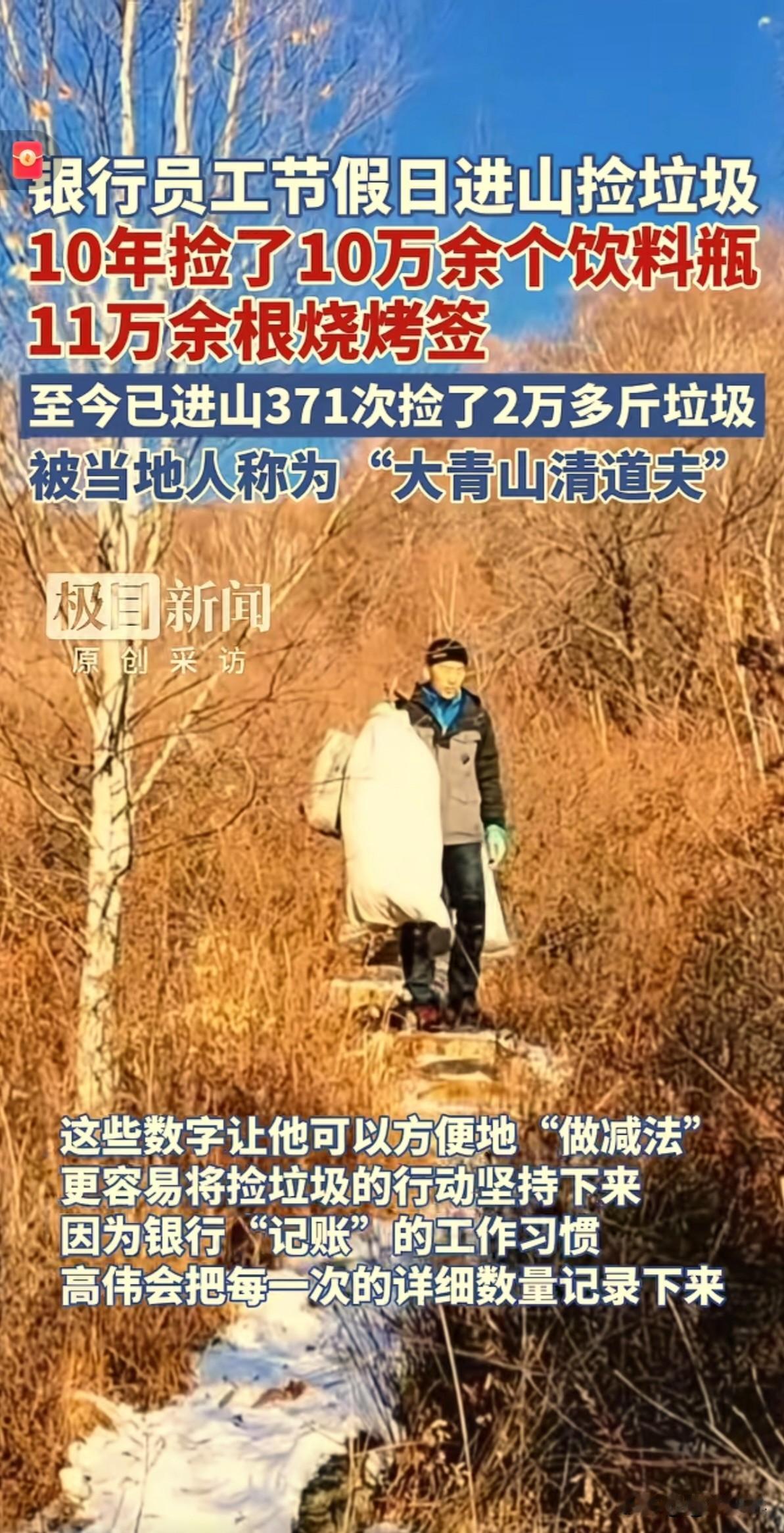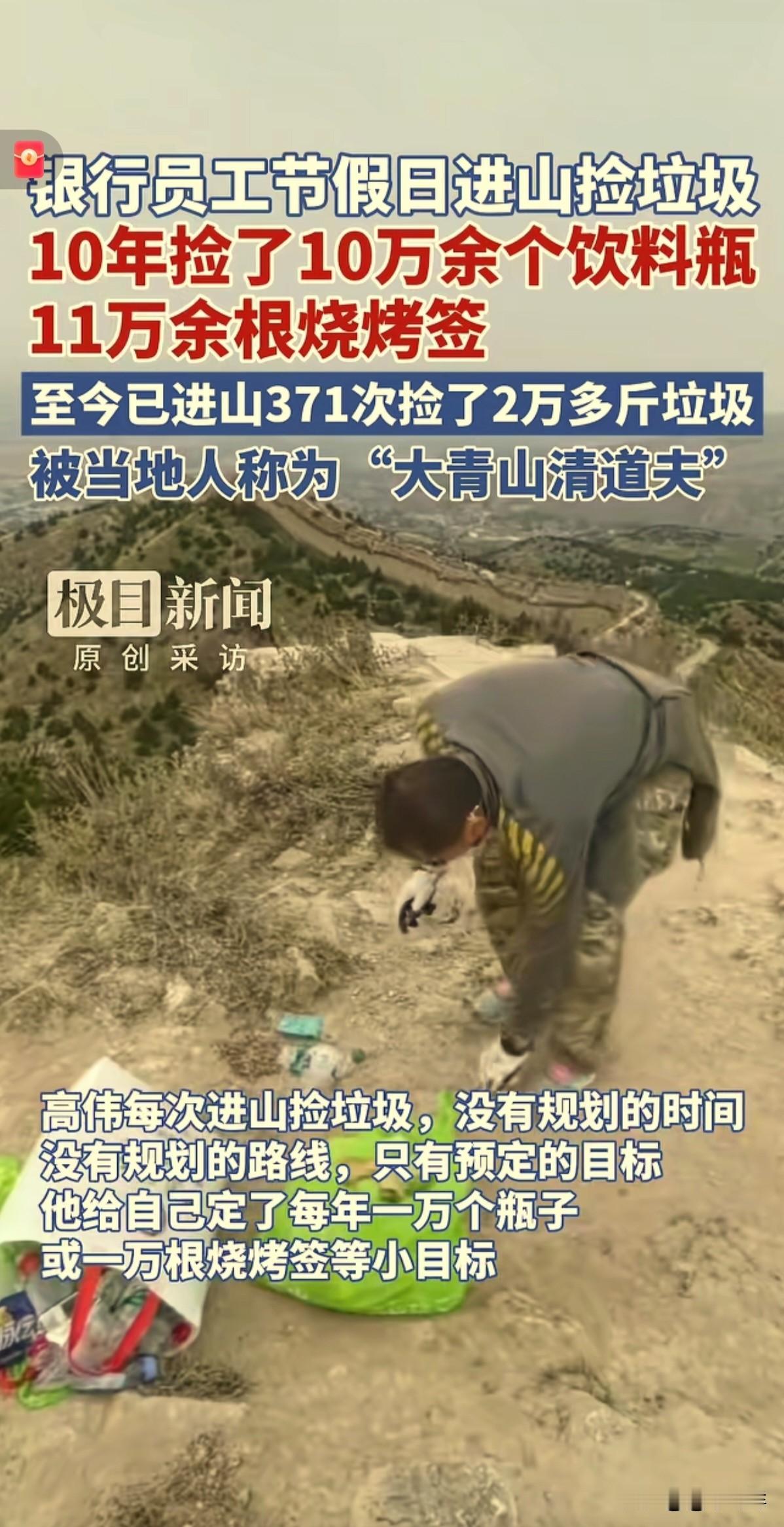 这下真的瞒不住了,不止感动了内蒙古,而且感动了全国人民![心][心][心] 这个银行员工叫高伟,他感动人们的事情,仅是来源于一件普通不能再普通的事情:捡垃圾。就这件事,他坚持了10年,每次游玩都会带着蛇皮袋子进山,不知不觉进山的次数高达371次。 10年捡垃圾的成果: 饮料瓶103982个, 烧烤签116100根, 其他垃圾3894.94斤 …… 这十来年,他捡的总共有21600多斤各类垃圾,卖废品的8000多元钱,一分不剩全捐了!他不仅一个人捡垃圾,还拉着退休的妻子一起加入“捡垃圾阵营”。 高伟说:每次进山捡垃圾,没有规划的时间,没有规划的路线,只有预定的目标:给自己定了每年一万个瓶子或一万根烧烤签等目标。 高伟被当地人称赞为“大青山清道夫”![大笑][大笑][大笑]做一件事情很容易,但十年如一日做同一件事情却很难!我们呼吁很多的人加入清理大山队伍,也祈愿各位游客旅游时提高自觉性,不乱扔垃圾,爱护大山! 为高伟先生的行为点赞![赞][赞][赞]