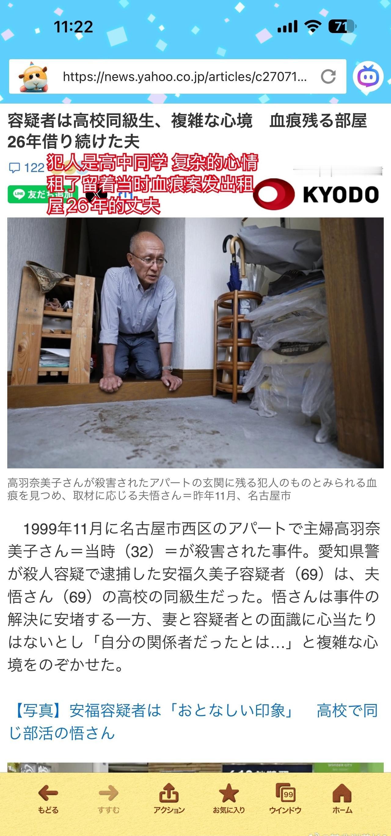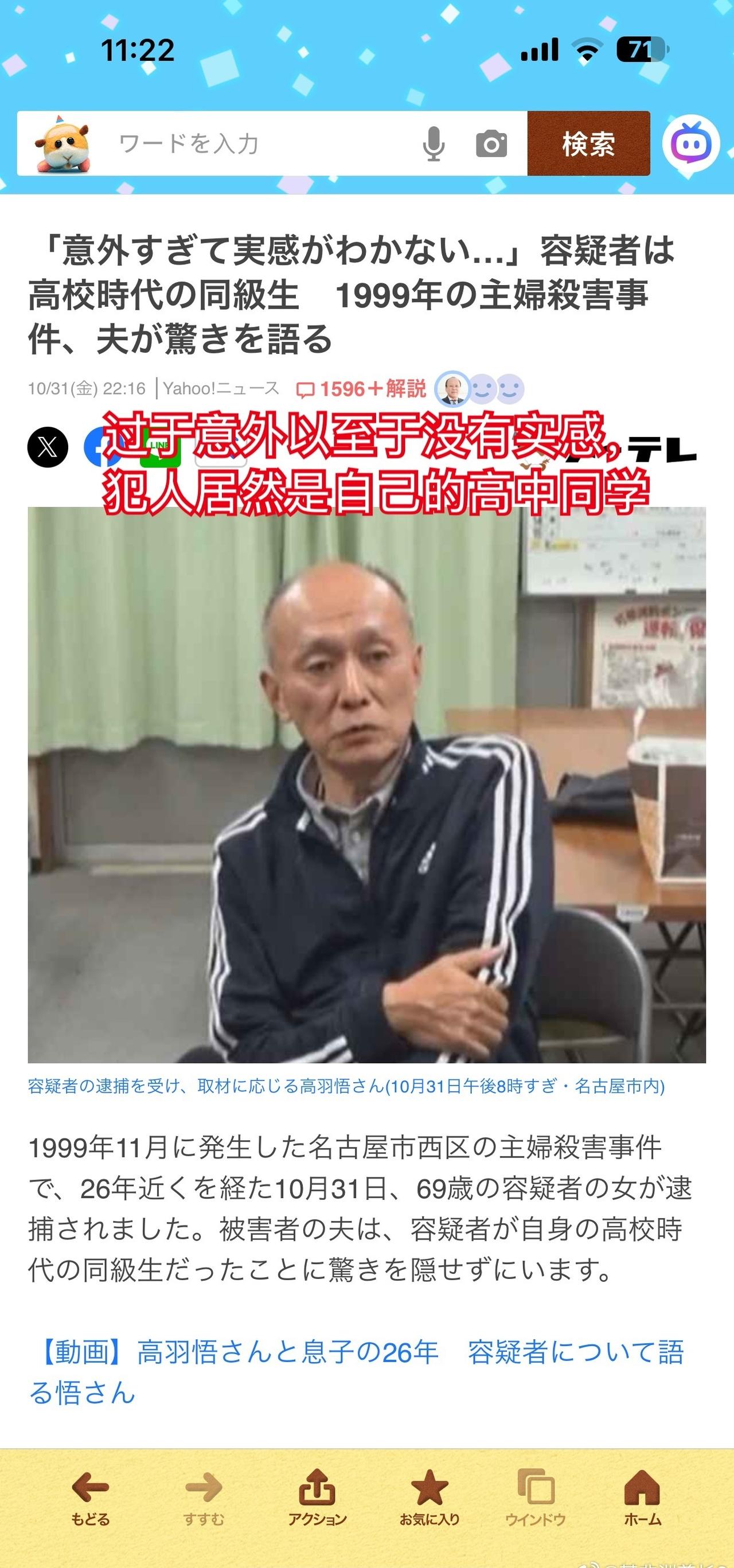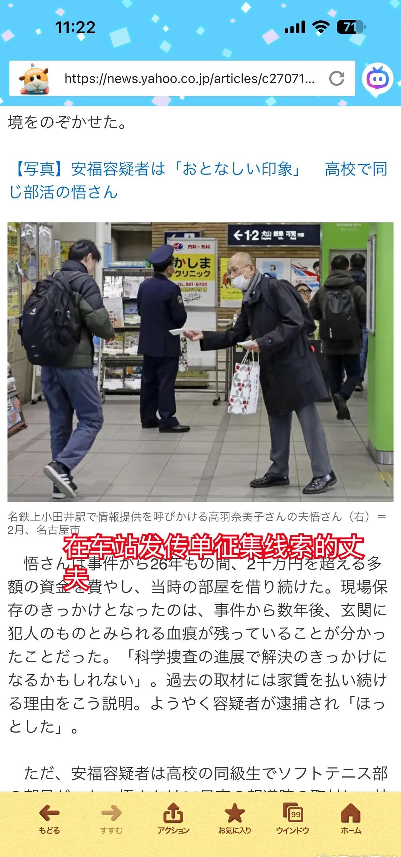 来讲讲这个名古屋西区的著名悬案,这个案子在日本非常有名拍过不少记录片,被害人丈夫为了能抓到凶手26年来一真租着当年案发的房子维持原状,加上定期发传单寻找线索啥前前后后自费了约2000万日。 1999年时年32岁的妻子 高羽奈美子 在家中被害倒在玄关,当时2岁的儿子没事(怎么一股子你推的孩子既视感),然后这案子就一直找不到啥有力线索,直到昨天犯人(69岁女性)突然向警方自首,犯人是丈夫高中同学,当年和丈夫一起在软式网球部,还追过丈夫给送过情书和情人节巧克力…… 昨天警方向丈夫报喜说犯人抓到了,是你高中同学,让丈夫猜犯人,结果丈夫一下子就猜对了…… (这么重要的嫌疑人当年怎么筛查的……) 丈夫接受采访时表示当年最后一次见犯人是1998年的高中同学聚会,就说自己已经结婚了对面也没啥大反应。