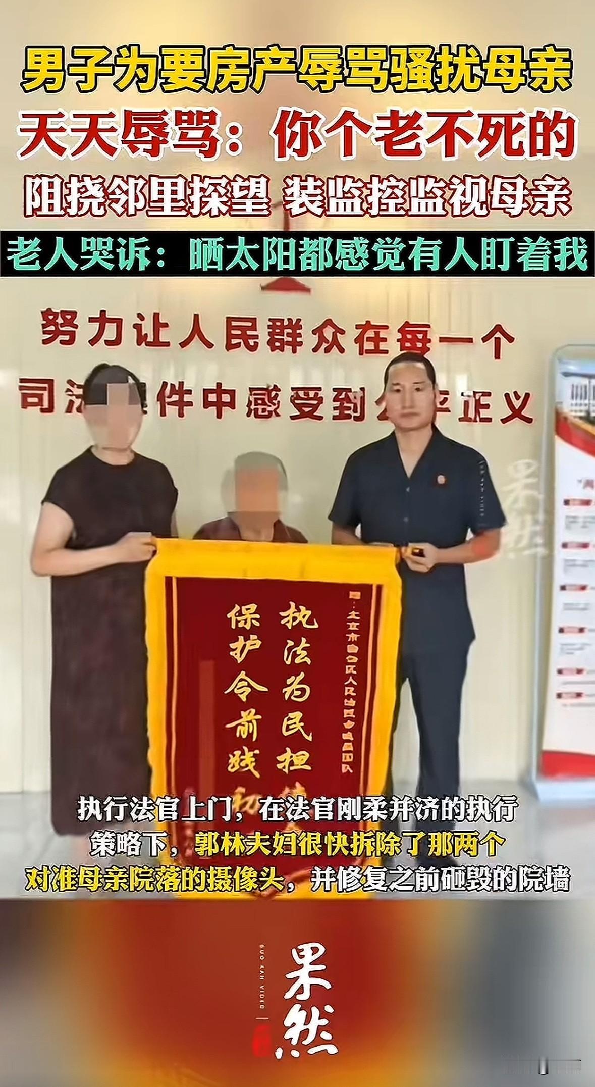 北京密云九旬刘老太的老宅要拆迁,儿子郭林夫妇想把产权全归自己,被拒后就长期辱骂老人,装摄像头盯着母亲院子,还砸了院墙。老人无奈申请人身安全保护令,郭林夫妇不收敛,直到强制执行才拆了摄像头、修了院墙。 父母的房子本就该由老人自主处置,子女没权利强行索要。为了房产伤害生养自己的母亲,既违背良心,也违反法律,辱骂骚扰他人可能被拘留。 赡养父母是义务,不是用房产交换的条件。亲情比钱财重要多了,就算没有房产,子女也该好好孝顺老人。法律能守住底线,可人心和亲情,得靠自己珍惜。