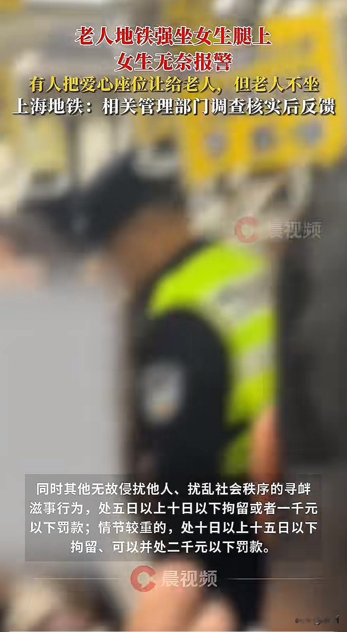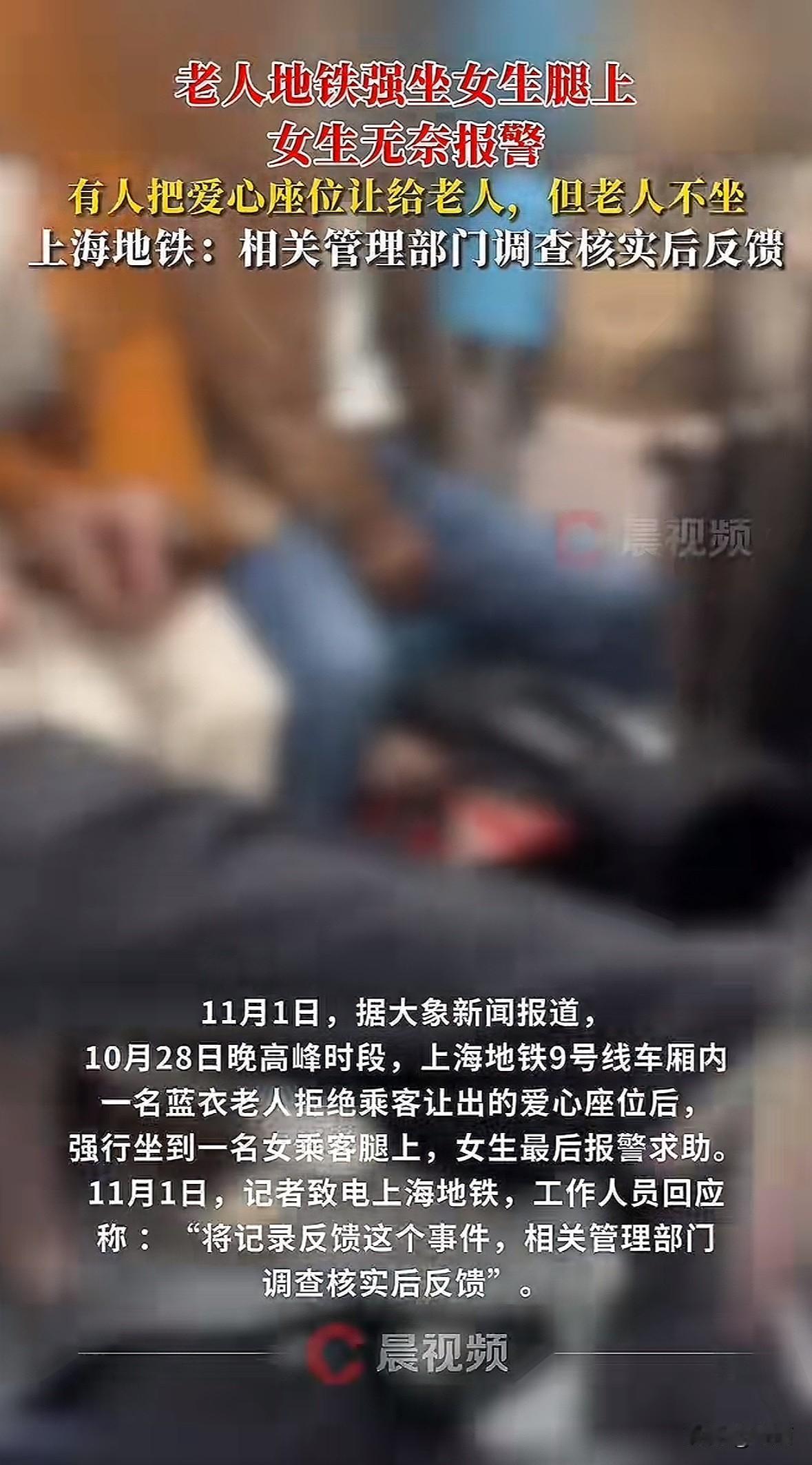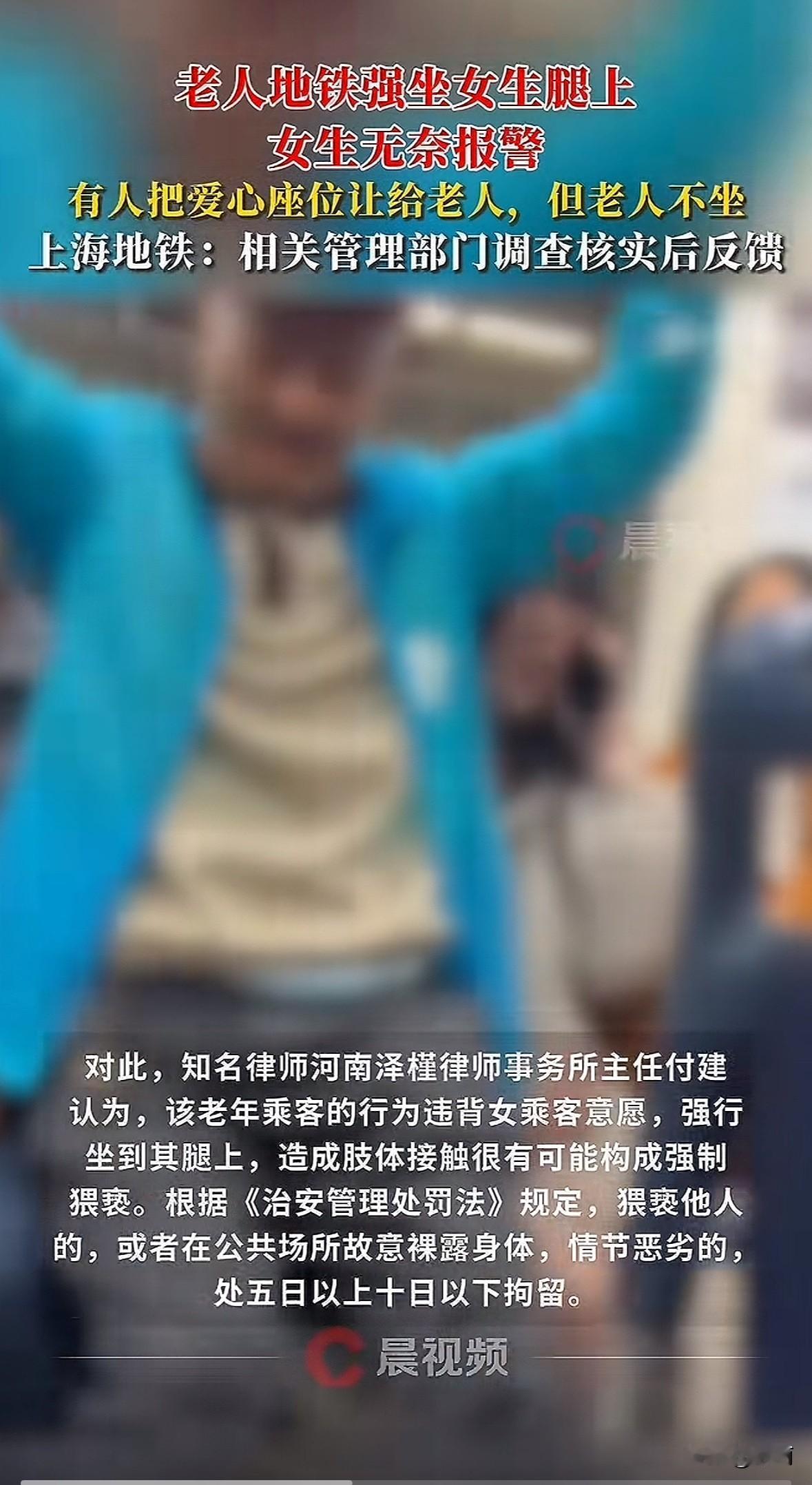 10月28日上海地铁9号晚高峰,蓝衣老人拒坐爱心专座,强行挤坐年轻女生大腿,还磨蹭露怪笑,女生避让无果后报警,民警到场带离老人。11月1日地铁工作人员称已记录,会调查反馈。律师说老人行为可能构成强制猥亵或寻衅滋事,可按《治安管理处罚法》拘留罚款。 尊老不是侵犯他人的借口,公共场合得守边界。女生的身体自主权受法律保护,任何人不能拿年龄当挡箭牌。不管老人精神状态如何,都不能突破法律和道德底线。遇事该依法处理,既维护受害者权益,也能警示他人,这样才能让公共空间更安全有序。