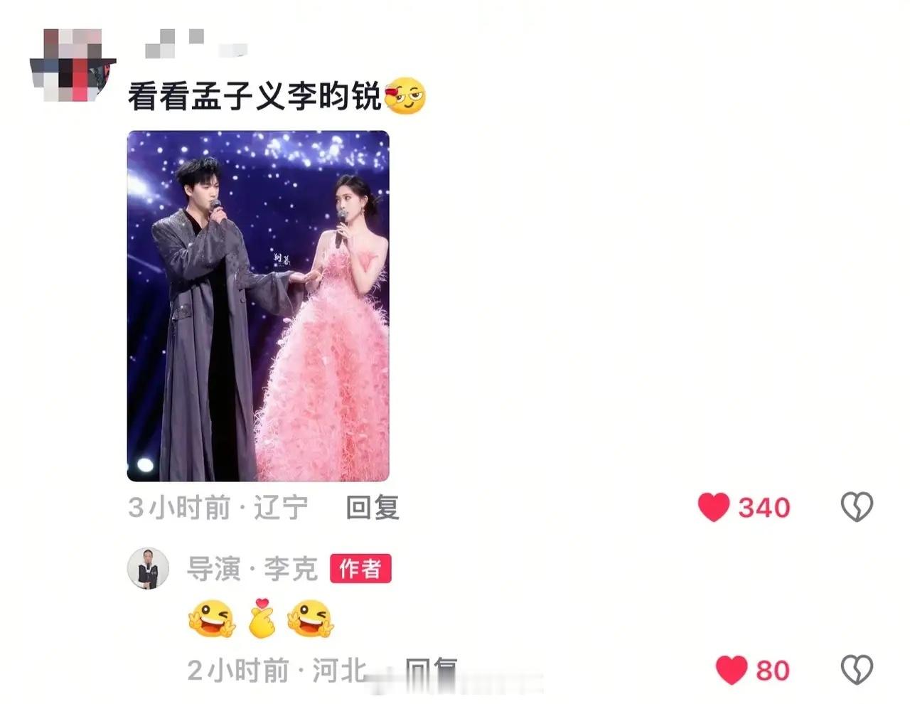 昀牵孟绕CP粉狂喜!孟子义、李昀锐有参与春晚的可能性,在导演李克问网友欢迎谁参与2026年春节联欢晚会的博文下,导演李克回复了CP粉评论。看来导演也有此想法,接我的CP也可以被春晚导演看到~