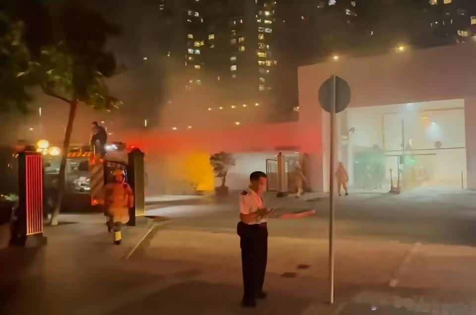 网传视频中可以看到,浓烟弥漫了整个停车场,消防员在起火车辆上盖好了灭火毯,同时在一旁准备好水枪,以防火势复燃。