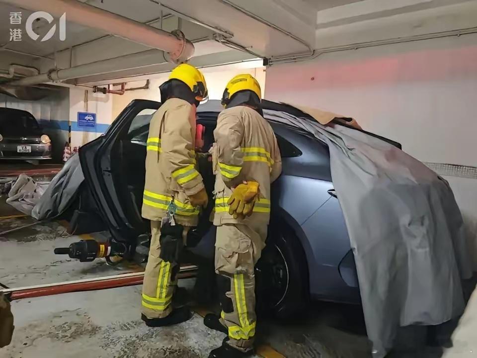 在香港电动汽车自燃起火后同样会进行覆盖处理,只不过人家用的是灭火毯,阻止火势蔓延的效果相当好。